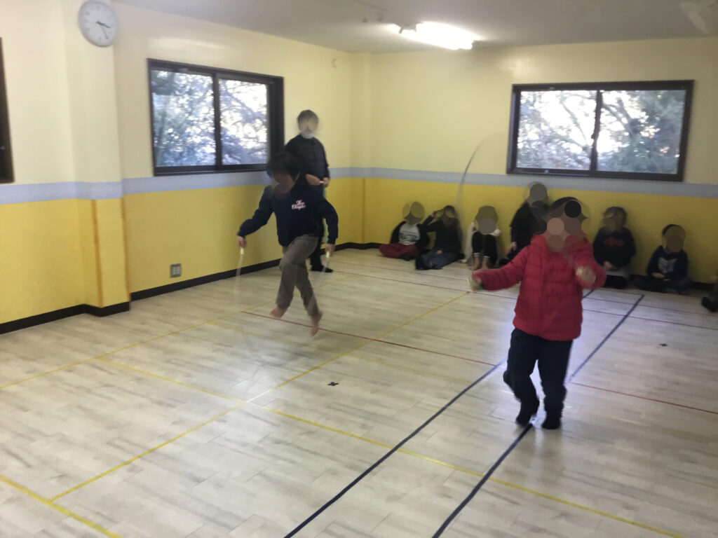 縄跳びでは、まず縄の持ち方や回し方を一つひとつ確認しながら、走り縄跳びと前跳びにチャレンジしました。走り縄跳びでは、縄の動きに合わせてリズムよく足を運び前に進みます。前跳びでは両足をそろえてジャンプするなど、飛び方の違いを意識しながら、ゆっくり丁寧に練習を進めました。はじめはタイミングを取ることに集中する姿が見られましたが、繰り返し取り組む中で、縄が足元に来る瞬間をしっかりと感じ取り、少しずつ自信をもって跳べるようになってきました。成功した時には笑顔があふれ、「できた!」という達成感を味わいながら、意欲的に取り組む姿が印象的でした💪