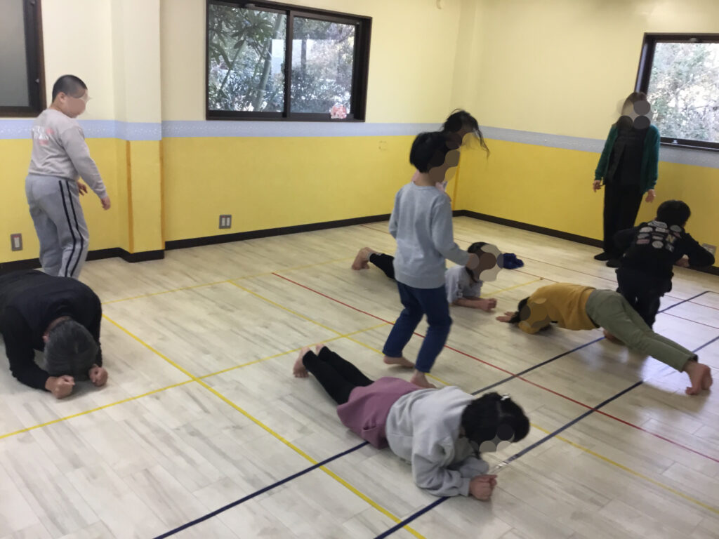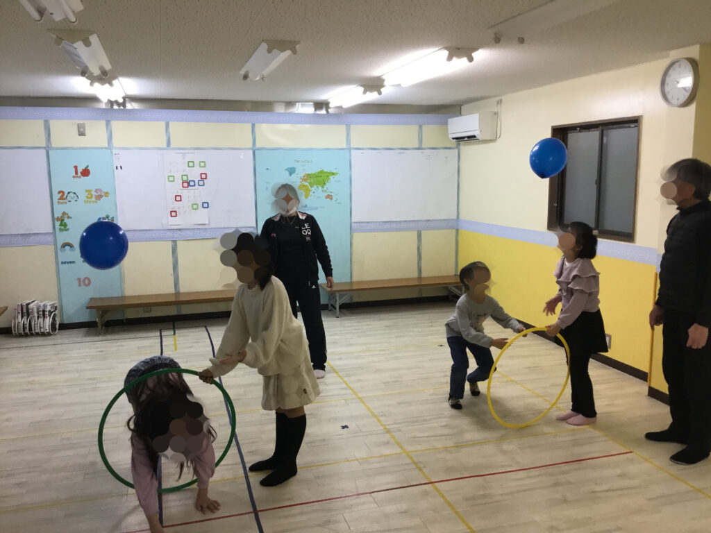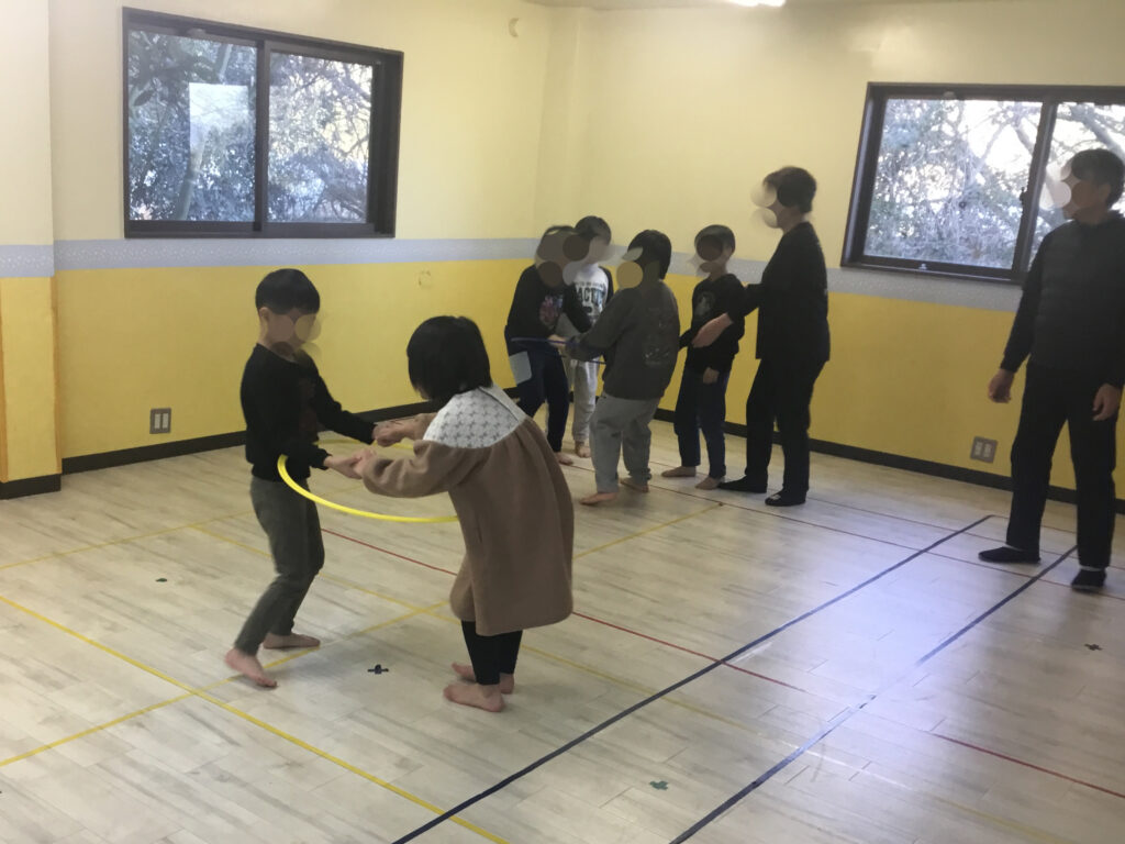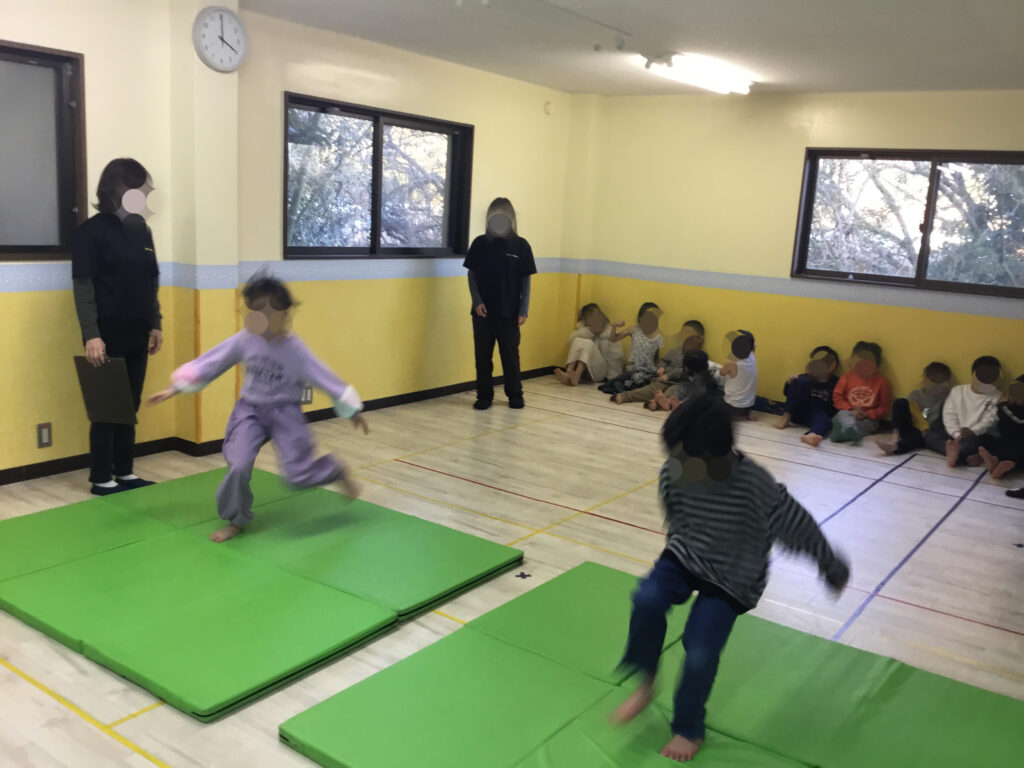 協力ジャンプでは、お友だちと2人組になり、一人が姿勢をしっかりとキープし、もう一人がそのお友だちを跳び越えるなど、役割を交代しながら協力してジャンプ活動に取り組みました。プランクの姿勢や足上げの姿勢、馬跳びなど、さまざまな姿勢に挑戦する中で、「動かないでいよう」「今だよ」と声を掛け合いながら、相手を思いやる姿も見られました。最後は難易度の高いフラフープジャンプにチャレンジ!2人でタイミングを合わせてリズミカルにジャンプ!息がぴったり合った瞬間には、思わず笑顔がこぼれ、達成感を共有しながら楽しく取り組む様子がとても印象的でした✨