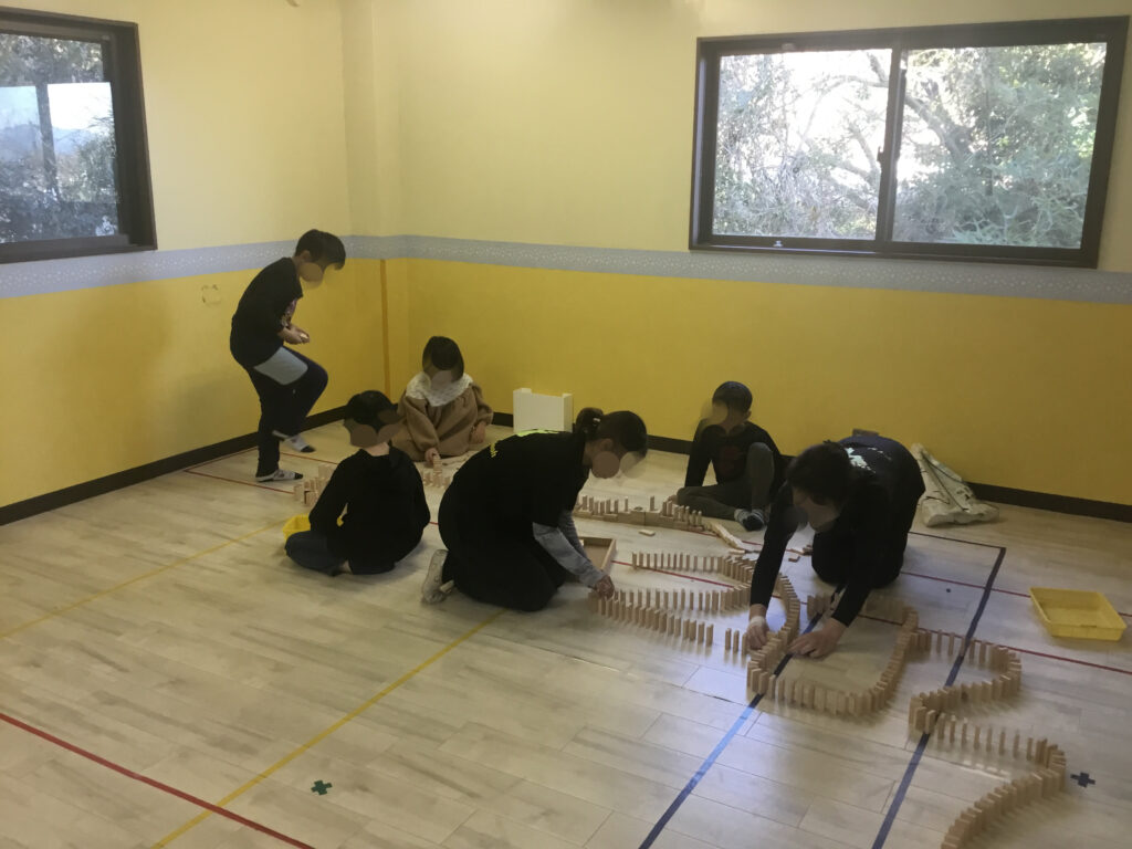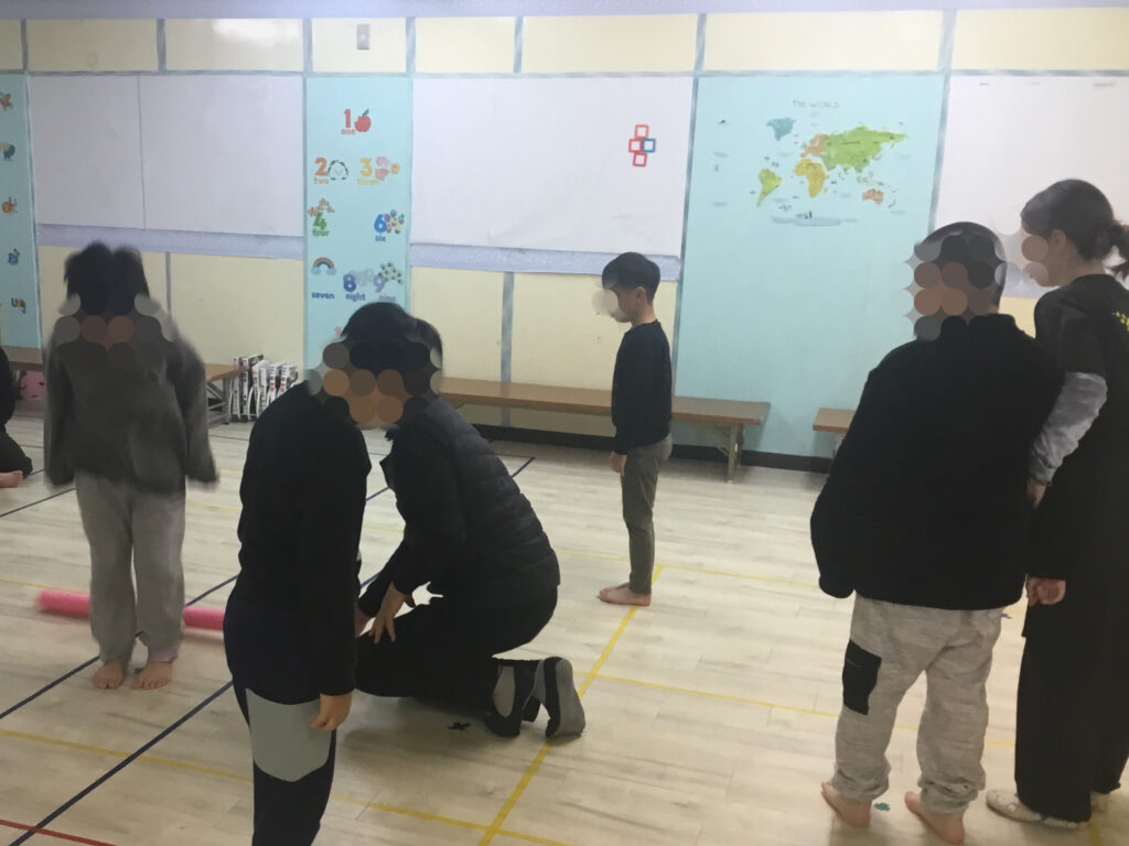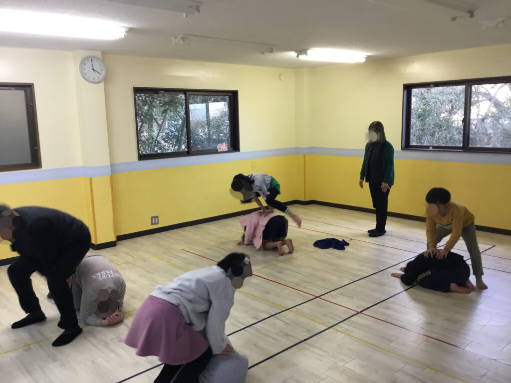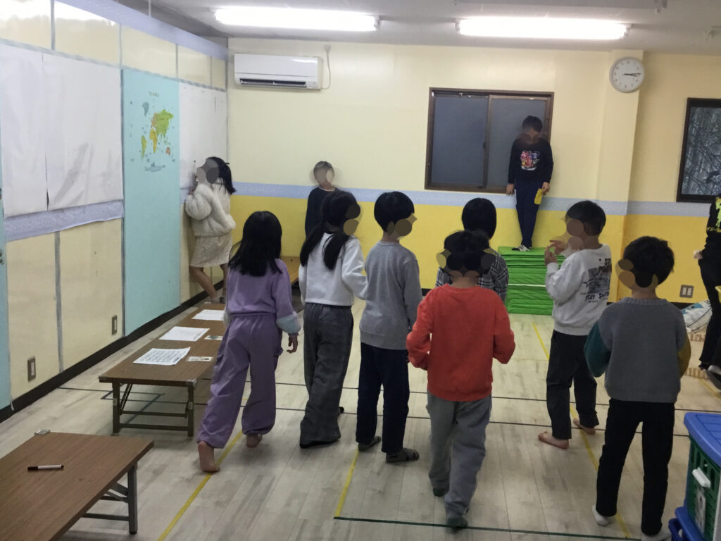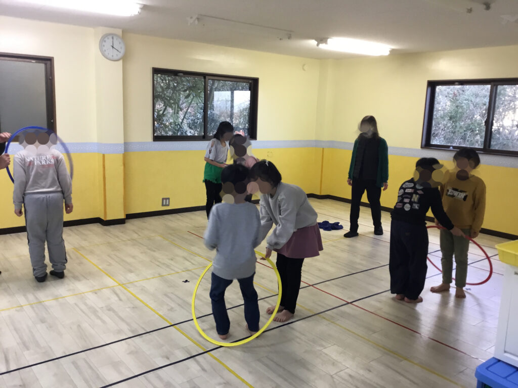 協力ジャンプでは、お友だちと2人組になり、一人が姿勢をしっかりとキープし、もう一人がそのお友だちを跳び越えるなど、役割を交代しながら協力してジャンプ活動に取り組みました。プランクの姿勢や足上げの姿勢、馬跳びなど、さまざまな姿勢に挑戦する中で、「動かないでいよう」「今だよ」と声を掛け合いながら、相手を思いやる姿も見られました。最後は難易度の高いフラフープジャンプにチャレンジ!2人でタイミングを合わせてリズミカルにジャンプ!息がぴったり合った瞬間には、思わず笑顔がこぼれ、達成感を共有しながら楽しく取り組む様子がとても印象的でした✨