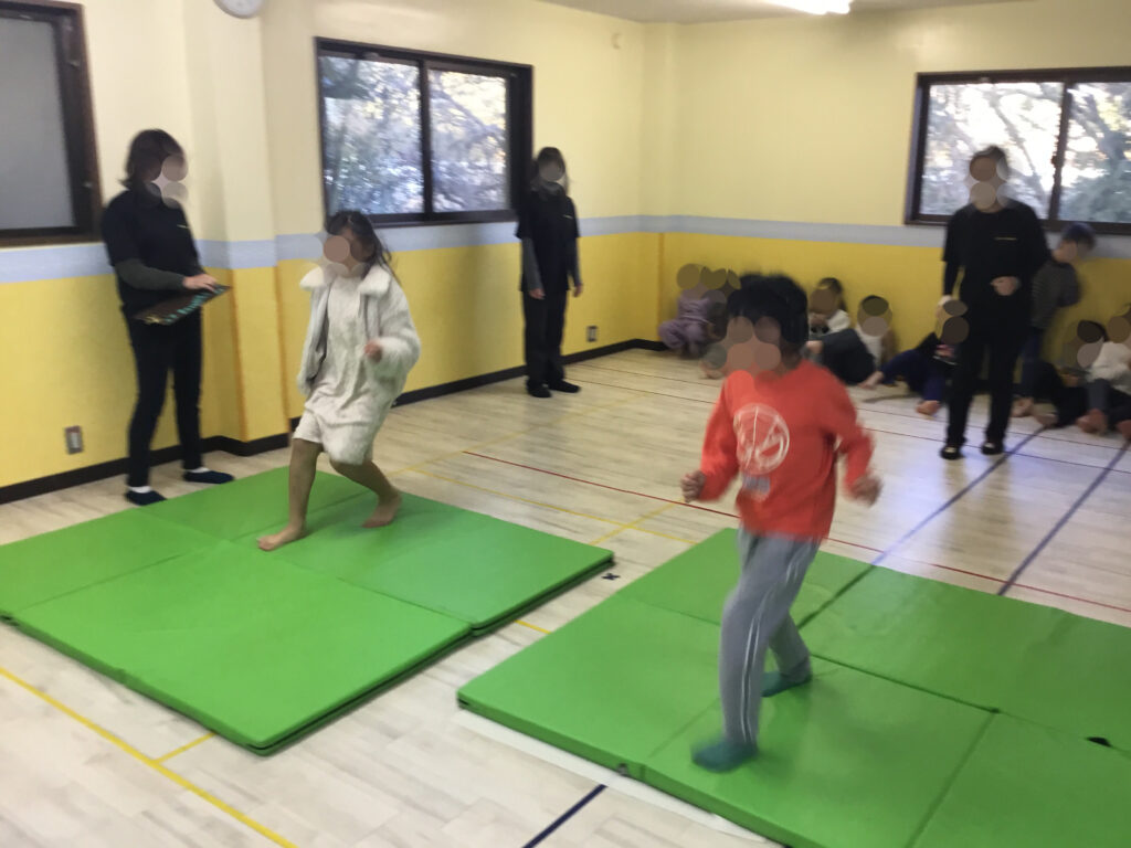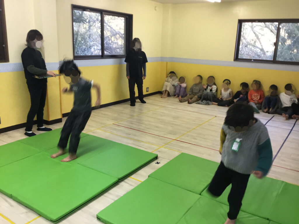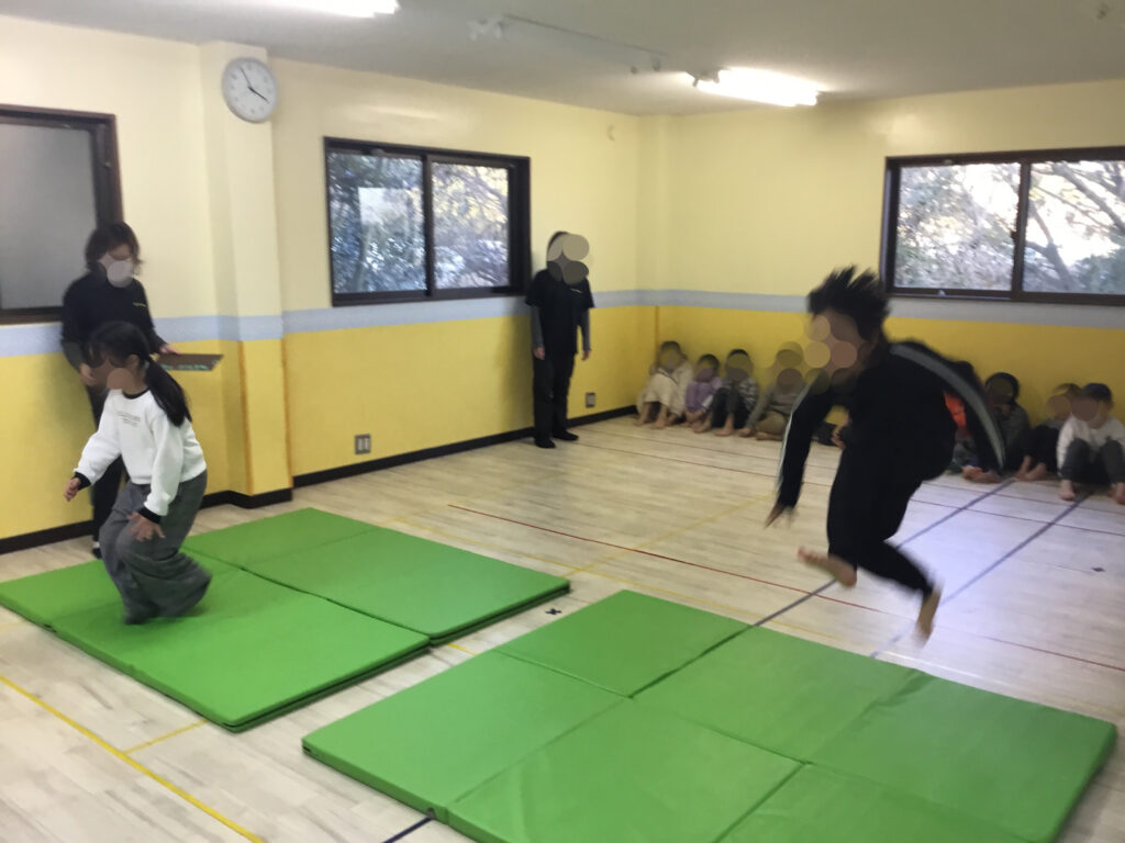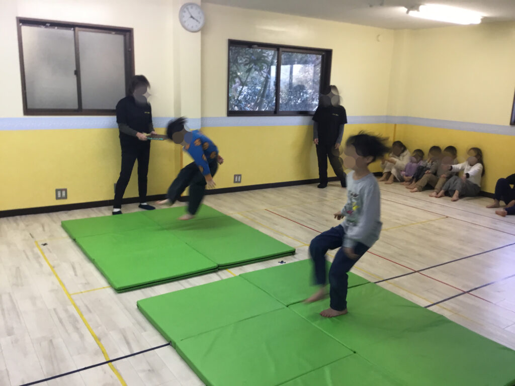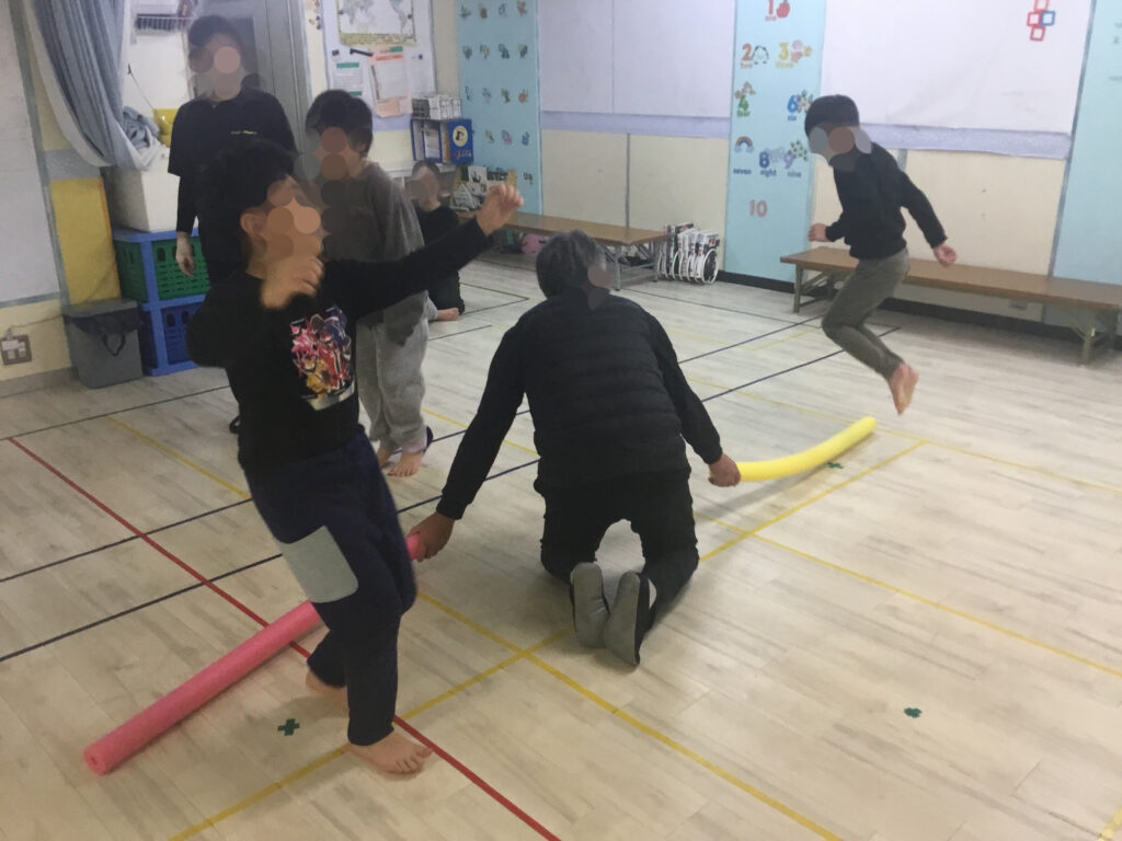棒ジャンプでは、回転しながら迫ってくるポリウレタン製の棒をよく見て、タイミングをはかりながらジャンプに挑戦しました。柔らかい素材の棒なので、「当たっても大丈夫!」という安心感の中、子どもたちは意欲的に取り組むことができていました。最初は棒が1本の状態からスタートし、慣れてくると2本へと本数が増え、さらに回転の速さも少しずつアップ!棒が近づいてくる様子をじっと見つめ、真剣な表情でジャンプする姿がとても印象的でした。素早く迫ってくる棒にドキドキしながらも、「今だ!」とタイミングをつかみ、楽しそうに跳ぶ姿から、チャレンジする気持ちと集中力が育まれました💪