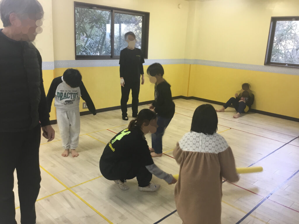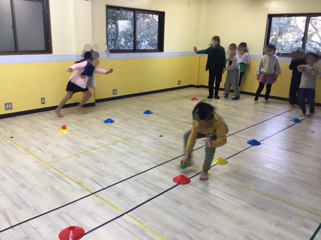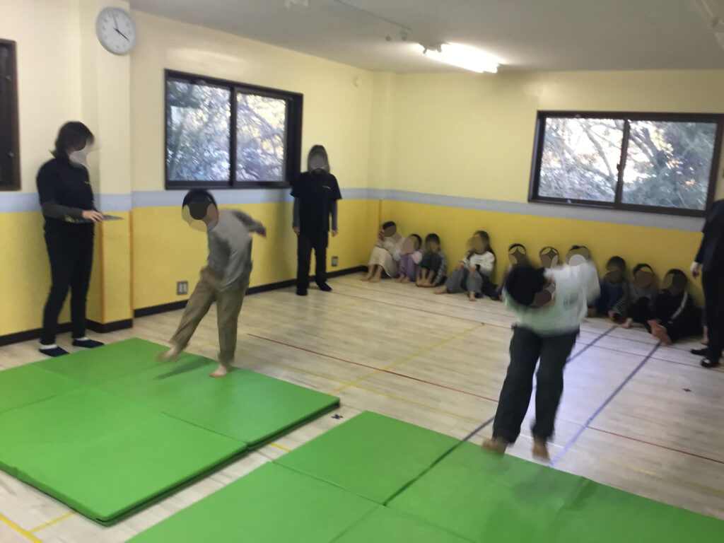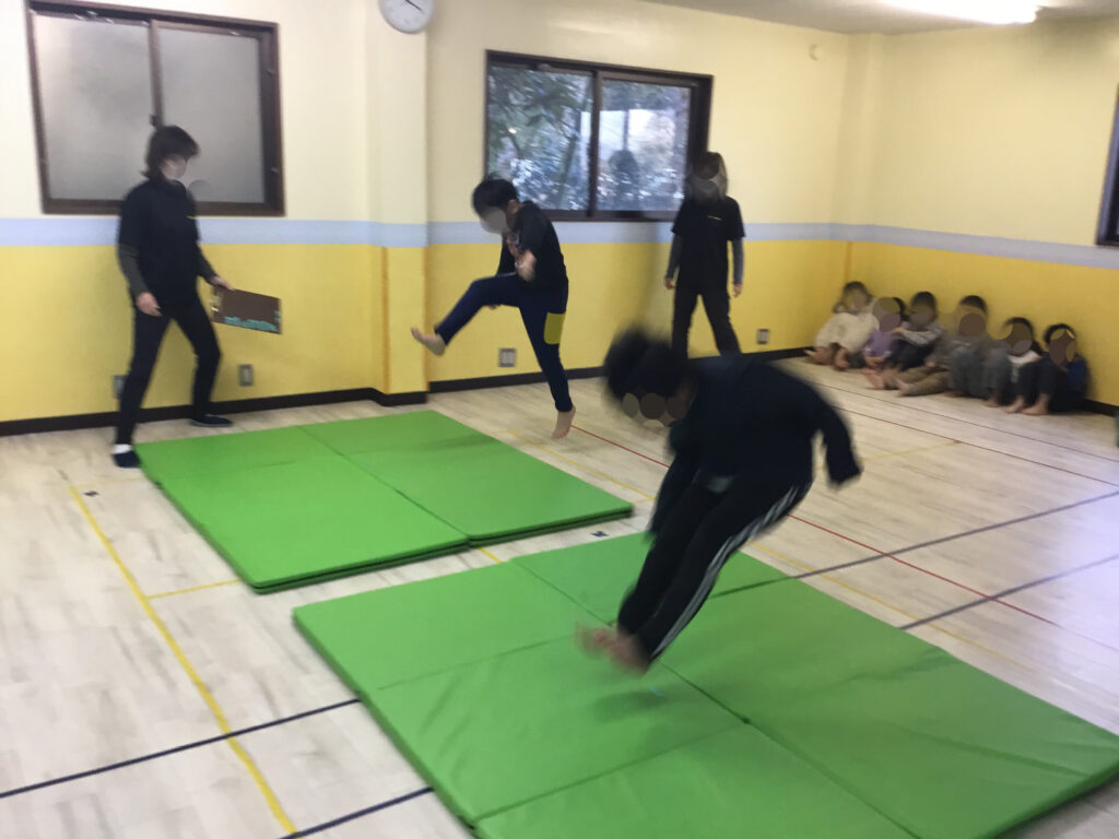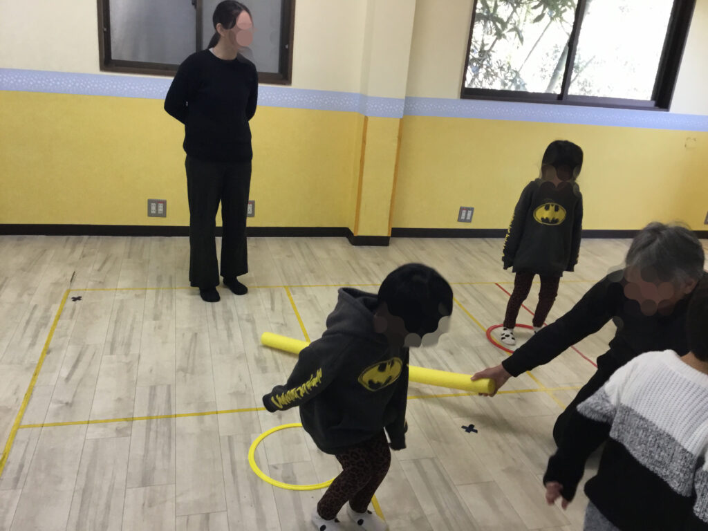 棒ジャンプでは、回転しながら迫ってくるポリウレタン製の棒をよく見て、タイミングをはかりながらジャンプに挑戦しました。柔らかい素材の棒なので、「当たっても大丈夫!」という安心感の中、子どもたちは意欲的に取り組むことができていました。最初は棒が1本の状態からスタートし、慣れてくると2本へと本数が増え、さらに回転の速さも少しずつアップ!棒が近づいてくる様子をじっと見つめ、真剣な表情でジャンプする姿がとても印象的でした。素早く迫ってくる棒にドキドキしながらも、「今だ!」とタイミングをつかみ、楽しそうに跳ぶ姿から、チャレンジする気持ちと集中力が育まれました💪