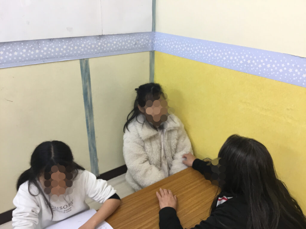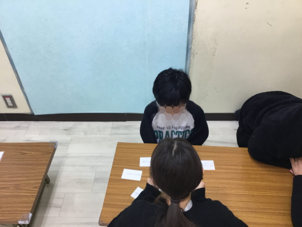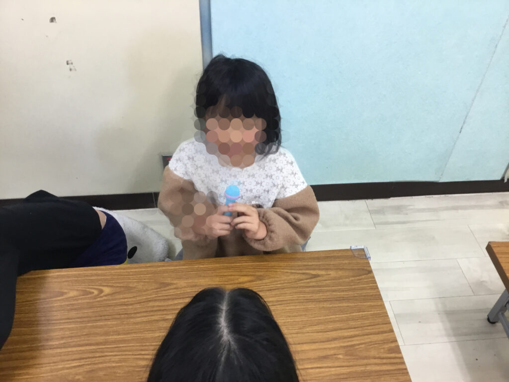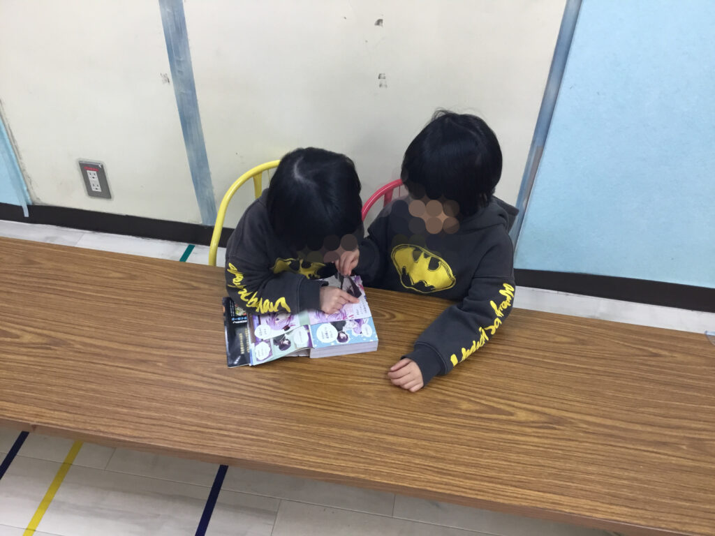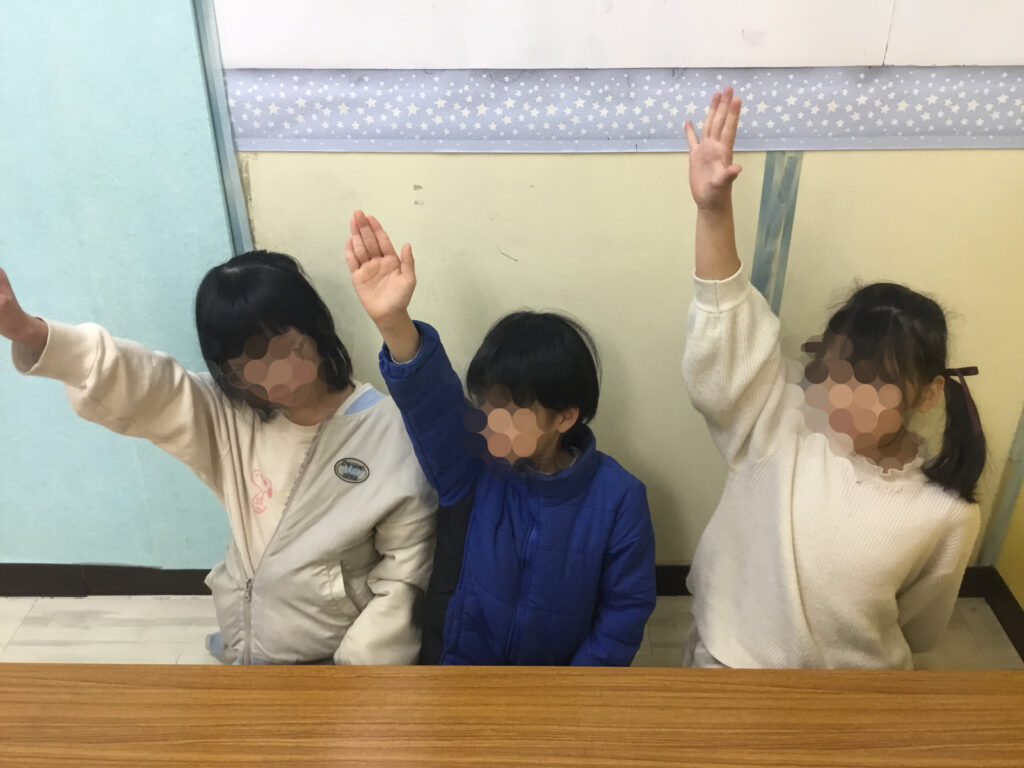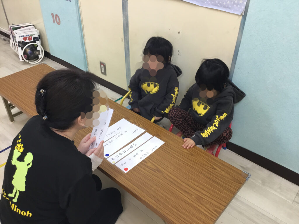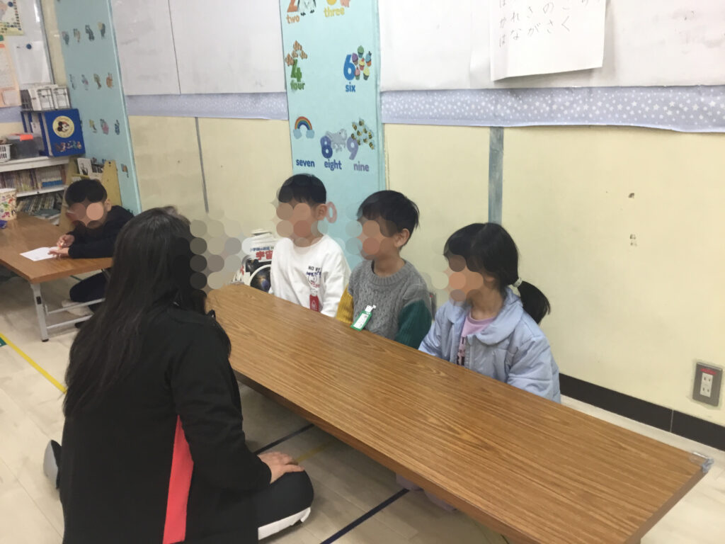 最初は一文字だけ抜いて歌い始め、色で囲まれた文字をよく確認しながら、歌詞をみながら歌っていきました。少しずつ抜く文字が増えていくと、思わず歌ってしまって「あっ!」と照れ笑いする場面も見られましたが、子どもたちは最後まで諦めず、歌詞にしっかり集中して取り組んでいました。