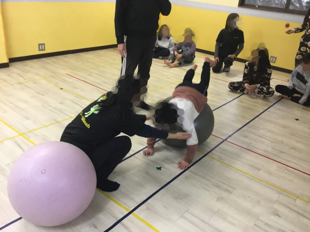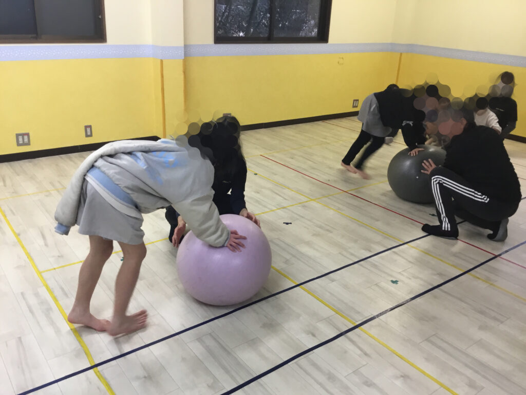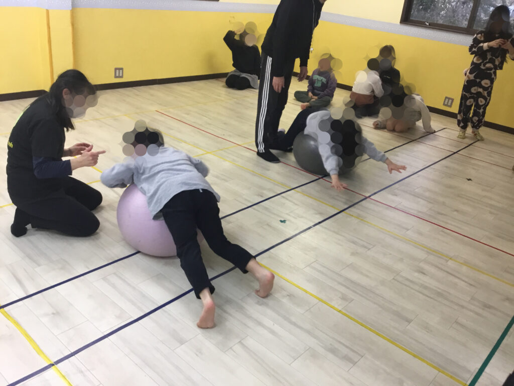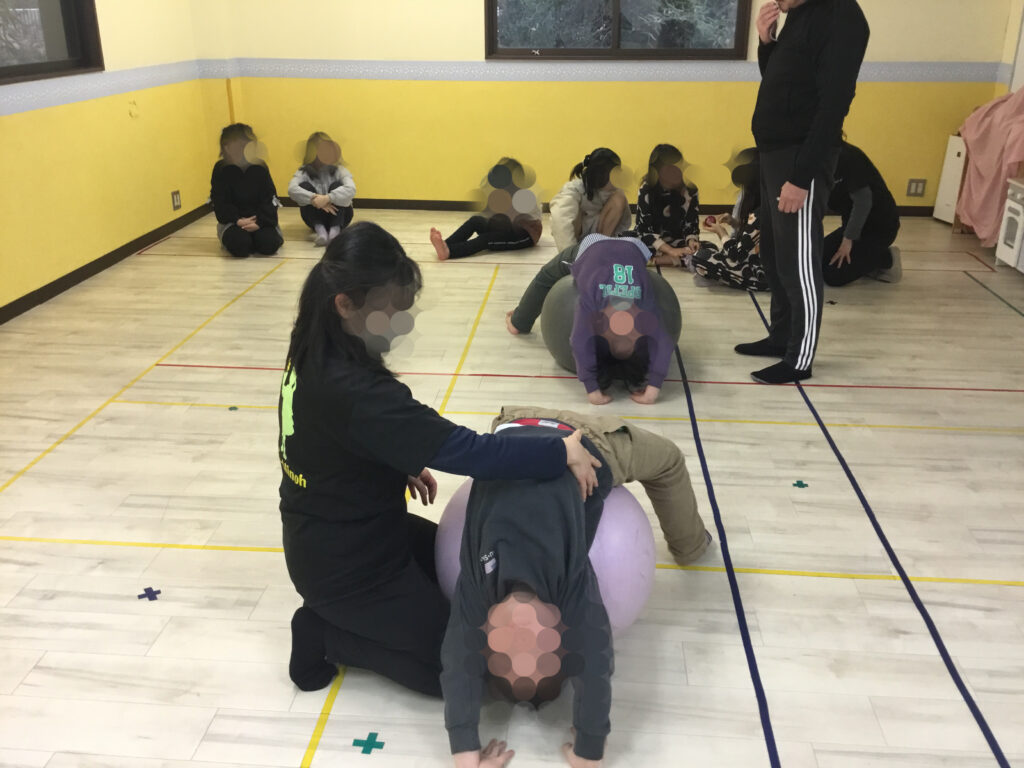 バランスボールの活動では、不安定なボールの上にお腹や腕、お尻など様々な身体の部位を乗せ、姿勢を保ちながらバランスをとることに取り組みました。指導員の説明をよく聞き、姿勢を一つひとつ確認しながらキープすることで、体幹の力やバランス感覚を養うことをねらいとしています。楽しみながら挑戦する中で、自分の身体の使い方への意識が高まり、集中して取り組む力や姿勢を保つ持続力の向上にもつながりました💪