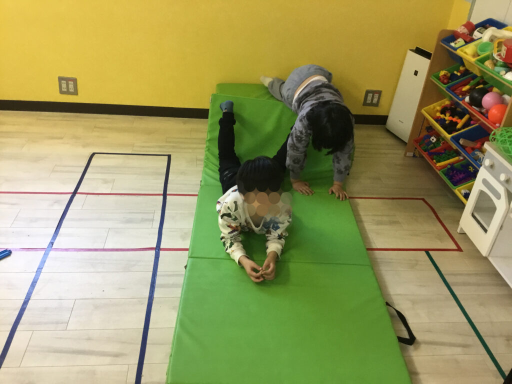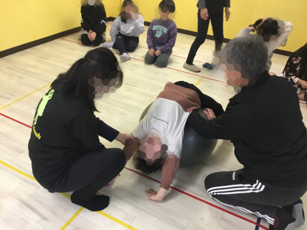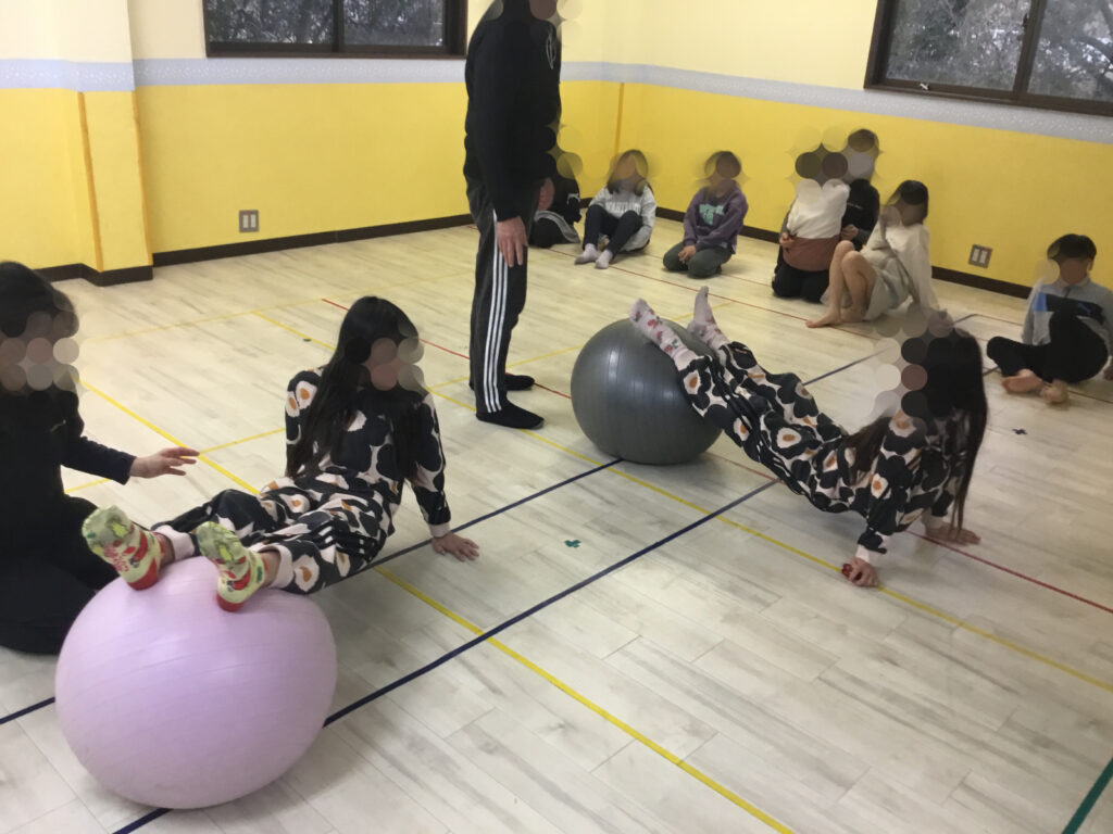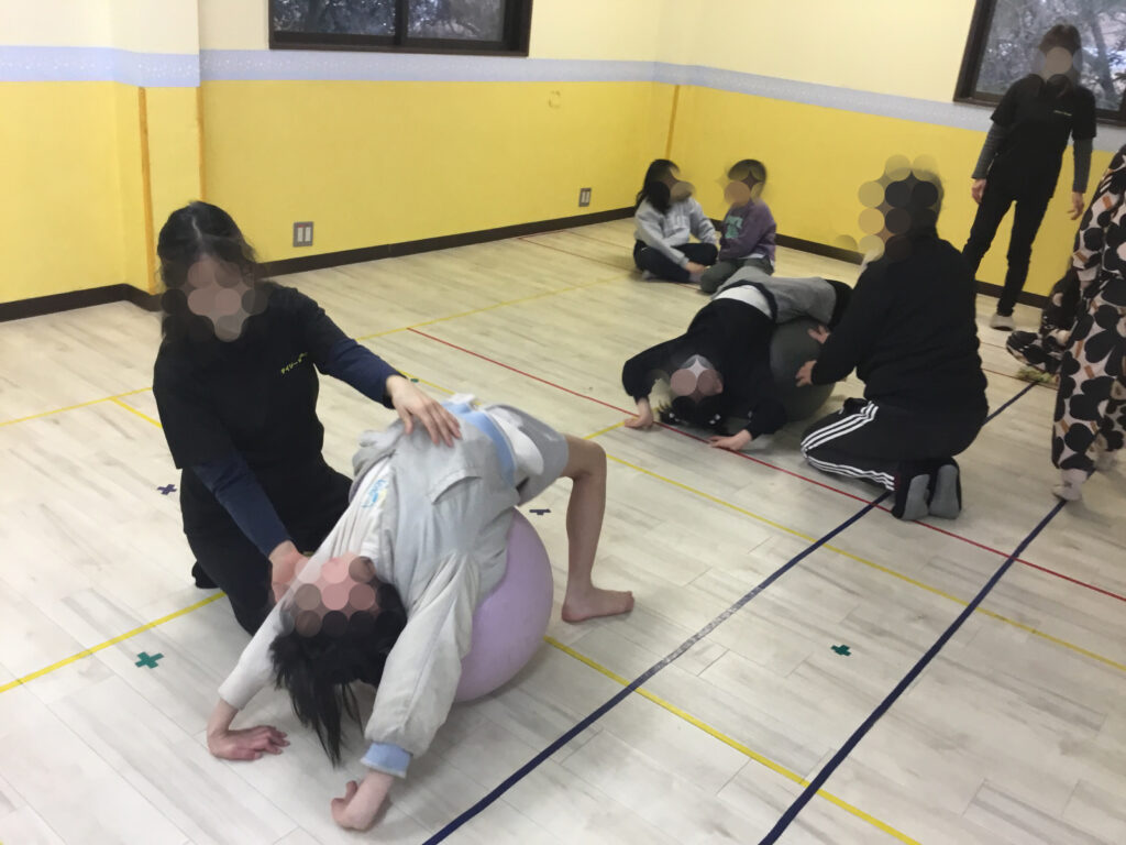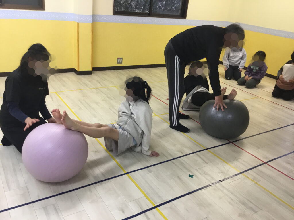 バランスボールの活動では、不安定なボールの上にお腹や腕、お尻など様々な身体の部位を乗せ、姿勢を保ちながらバランスをとることに取り組みました。指導員の説明をよく聞き、姿勢を一つひとつ確認しながらキープすることで、体幹の力やバランス感覚を養うことをねらいとしています。楽しみながら挑戦する中で、自分の身体の使い方への意識が高まり、集中して取り組む力や姿勢を保つ持続力の向上にもつながりました💪