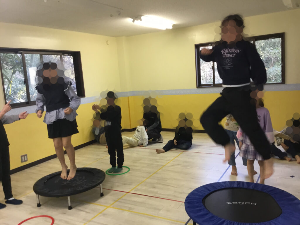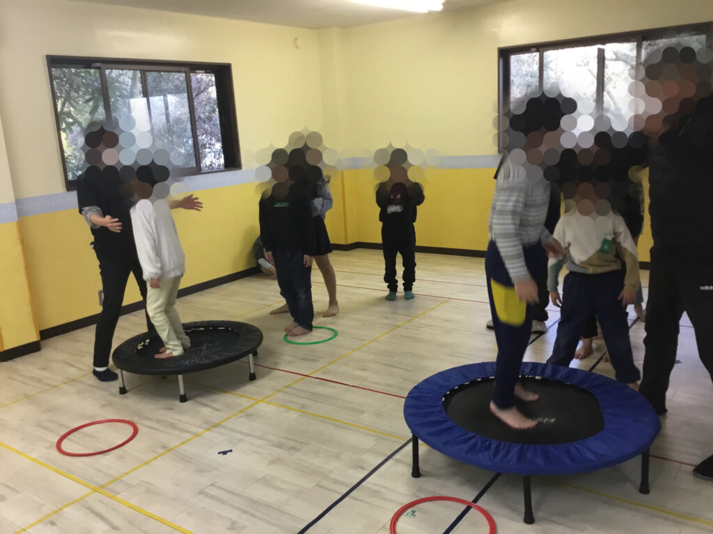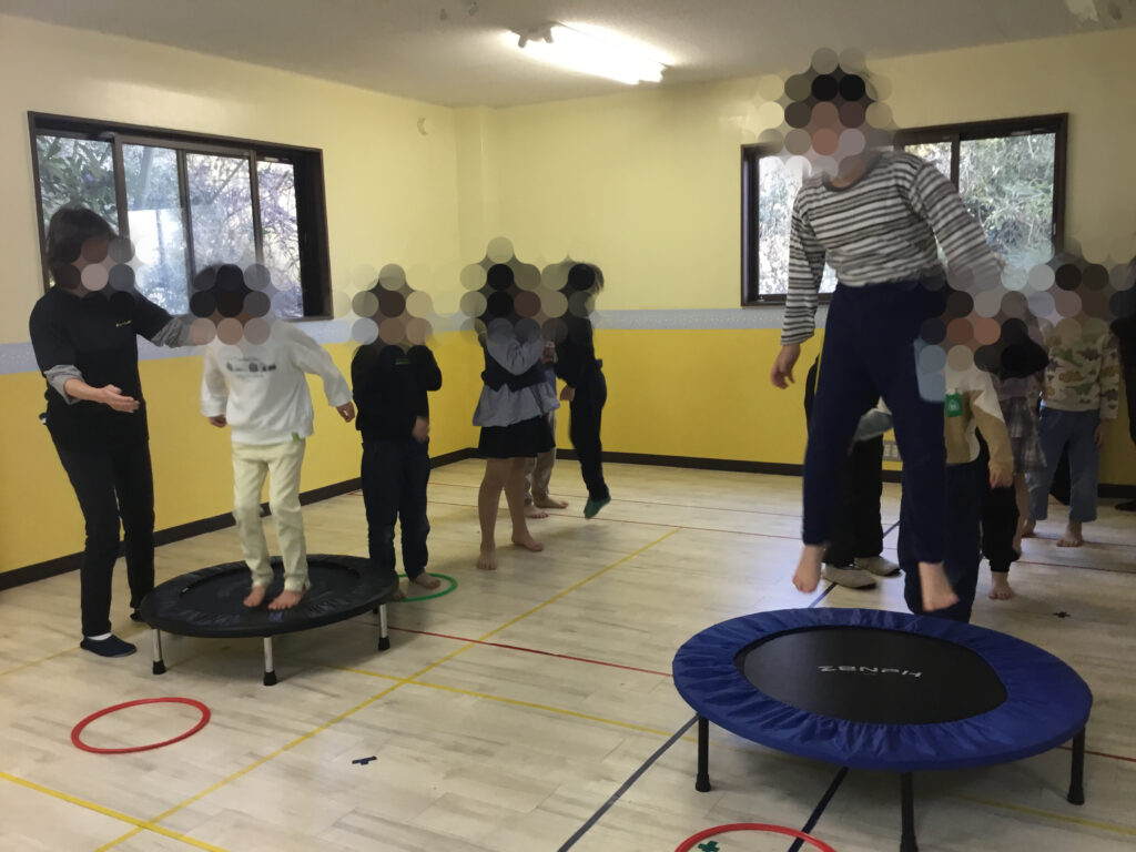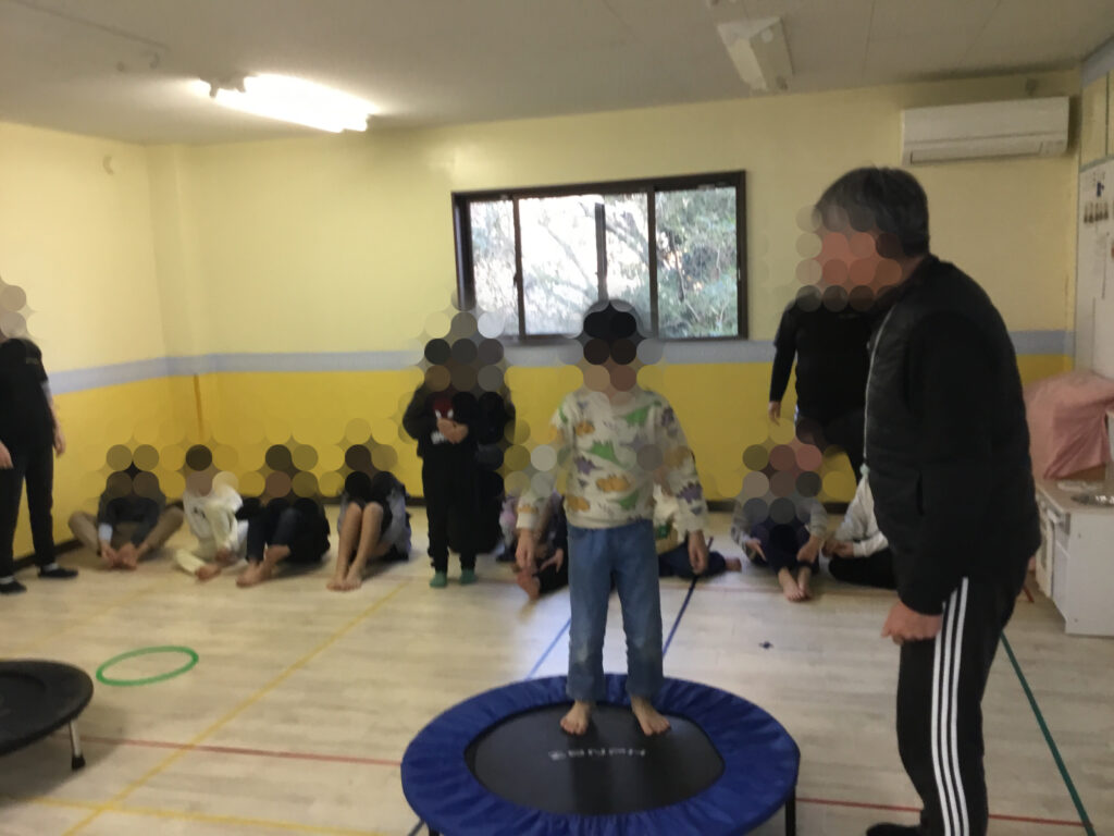 トランポリンでは、高く跳ぶことを意識したジャンプに加え、高く跳びながらのパージャンプやマリオのポーズでのジャンプに挑戦しました。さらに、自分で半回転か1回転かを選んで取り組むことで、目標を考えて行動する姿が見られ、意欲的に参加することができました。