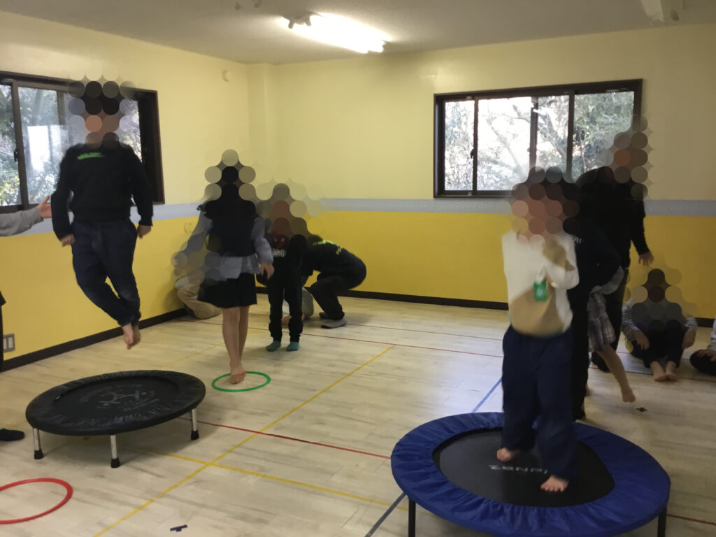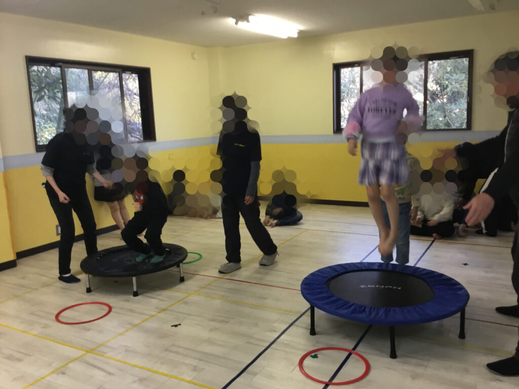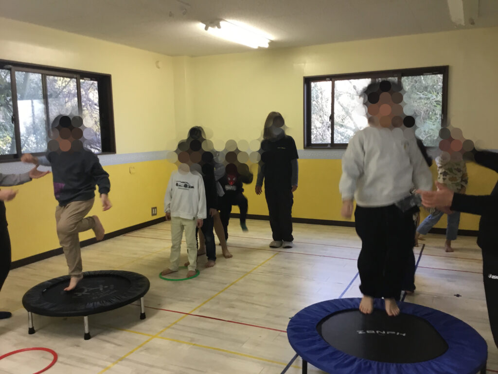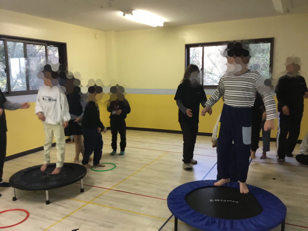 トランポリンでは、高く跳ぶことを意識したジャンプに加え、高く跳びながらのパージャンプやマリオのポーズでのジャンプに挑戦しました。さらに、自分で半回転か1回転かを選んで取り組むことで、目標を考えて行動する姿が見られ、意欲的に参加することができました。