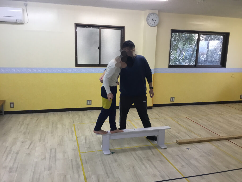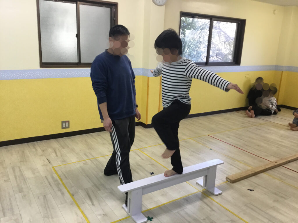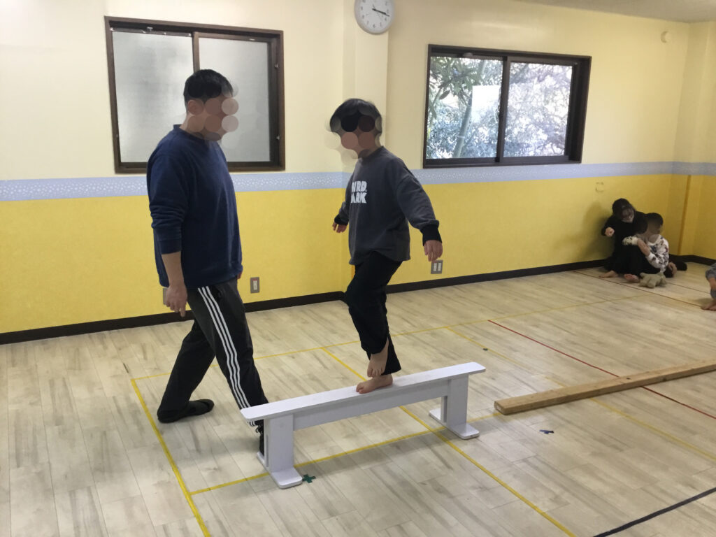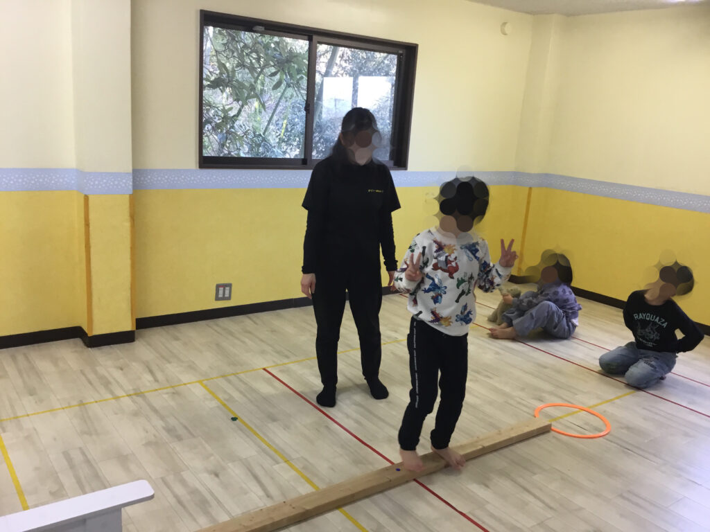 平均台では、前向き・横向き・後ろ向きと進む向きを変えながらバランスを保って歩き、途中で片足を上げたり回転したりと、さまざまな動きに挑戦しました。姿勢や足の置き方を意識しながら、一つひとつの動作に集中して取り組む姿が見られました。