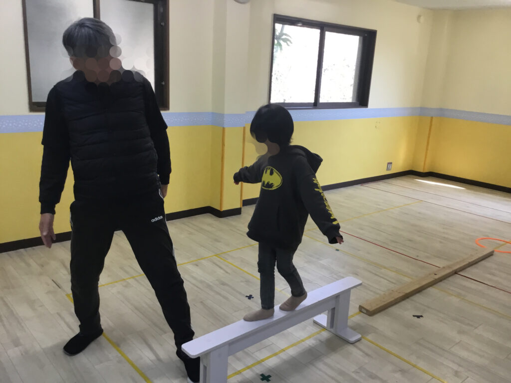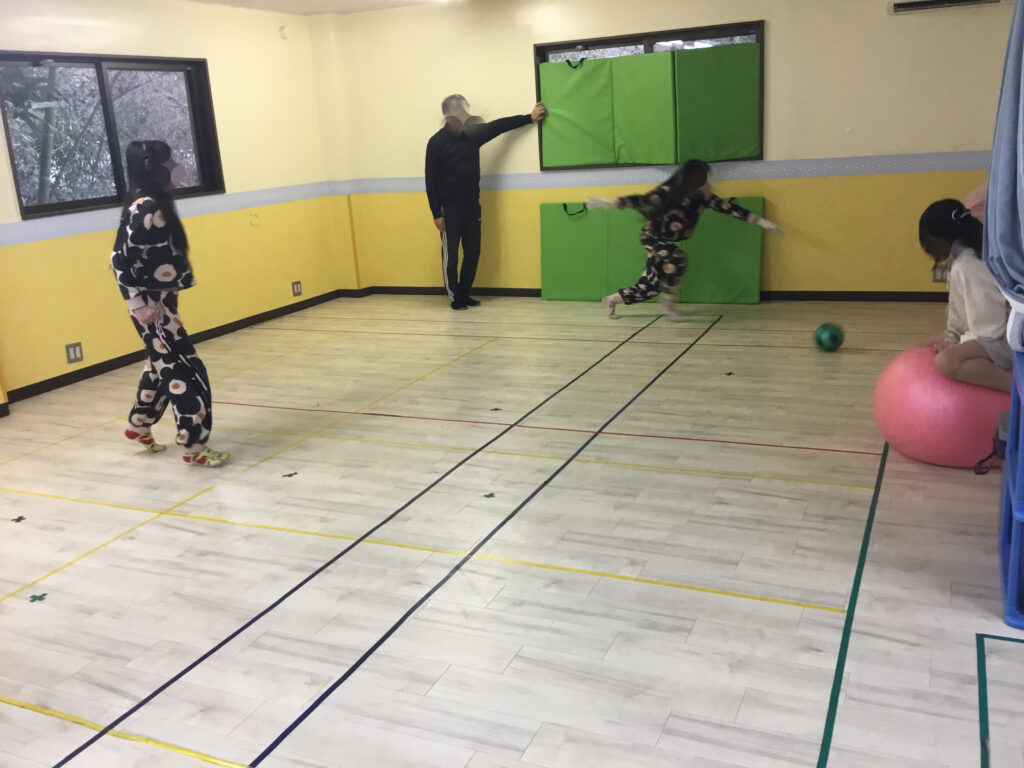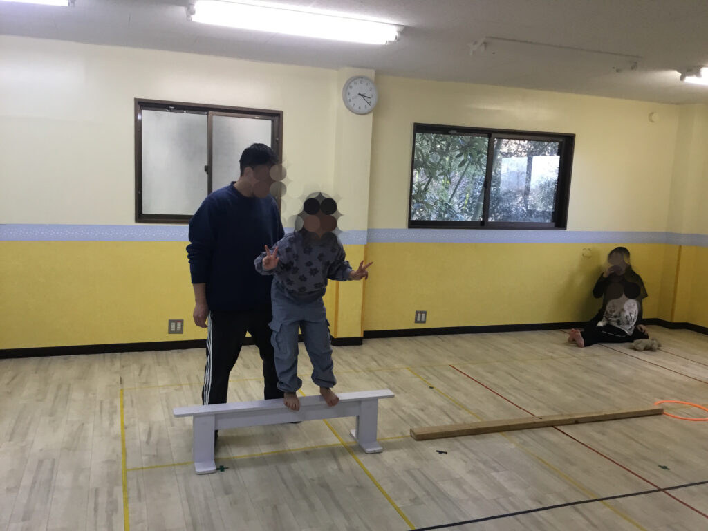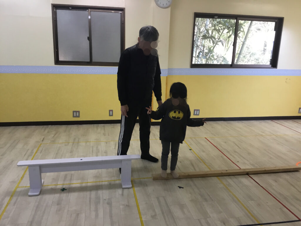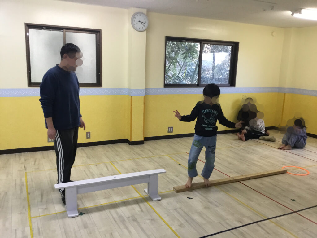平均台では、前向き・横向き・後ろ向きと進む向きを変えながらバランスを保って歩き、途中で片足を上げたり回転したりと、さまざまな動きに挑戦しました。姿勢や足の置き方を意識しながら、一つひとつの動作に集中して取り組む姿が見られました。