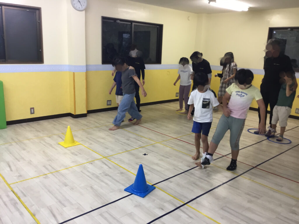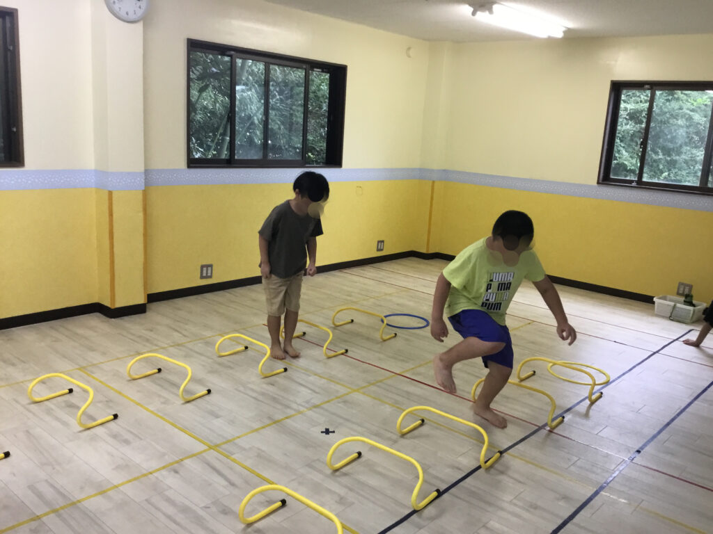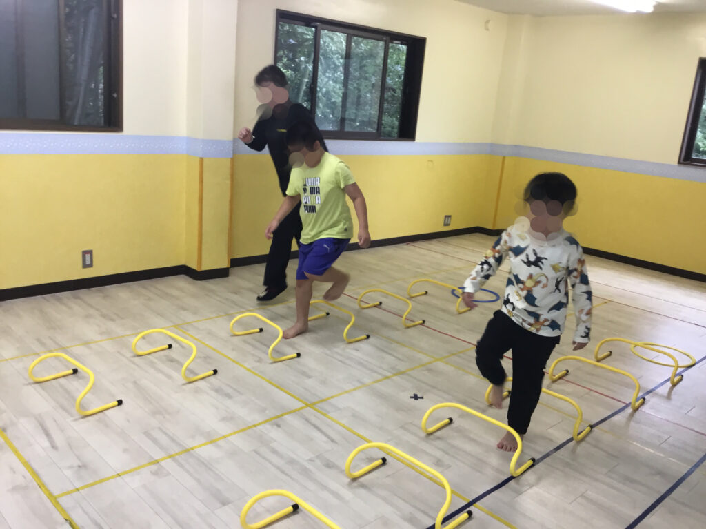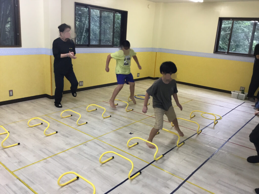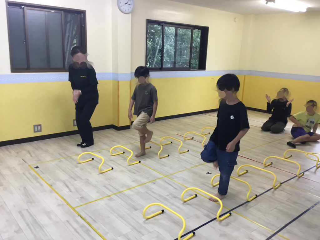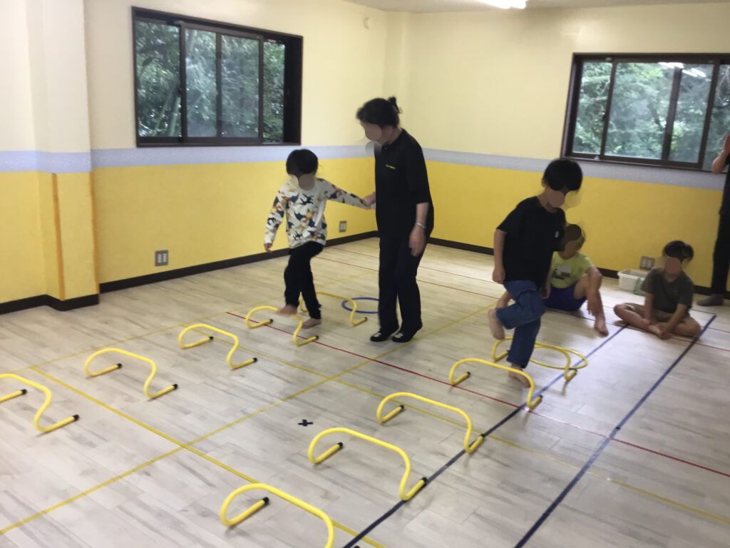 ジャンプハードルでは、低めのハードルをテンポのあるリズムに合わせて軽やかにジャンプしました。指導員の「1、2!」という掛け声に耳を傾け、テンポを意識しながら片足ずつリズムよく跳び越えていきます。リズムに合わせて体を動かすことで、リズム感やタイミングを取る力、そして全身のバランス感覚が育まれます。
