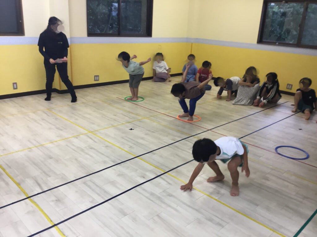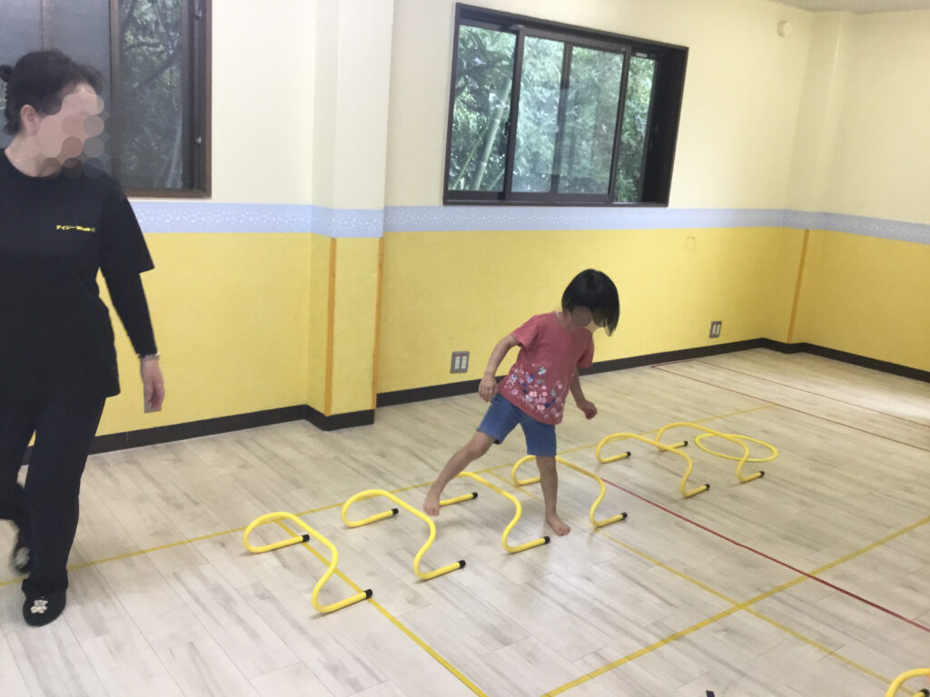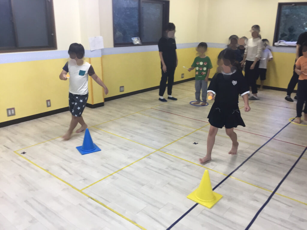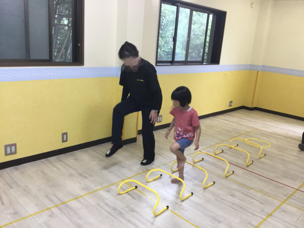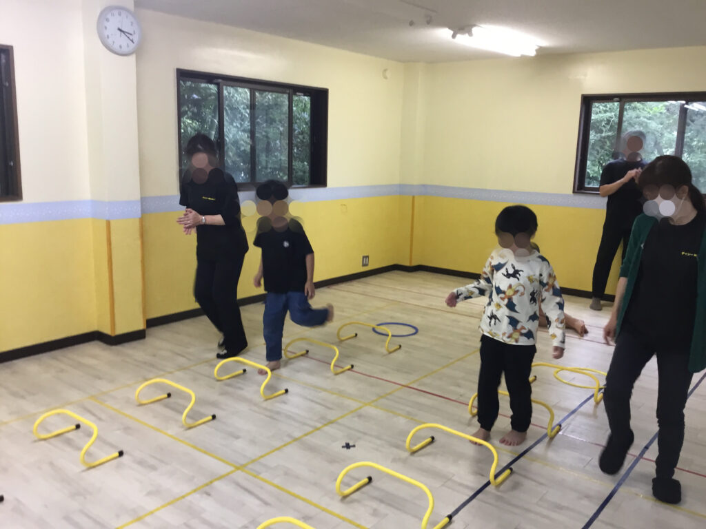 ジャンプハードルでは、低めのハードルをテンポのあるリズムに合わせて軽やかにジャンプしました。指導員の「1、2!」という掛け声に耳を傾け、テンポを意識しながら片足ずつリズムよく跳び越えていきます。リズムに合わせて体を動かすことで、リズム感やタイミングを取る力、そして全身のバランス感覚が育まれます。
