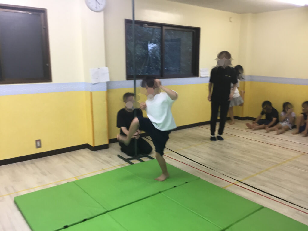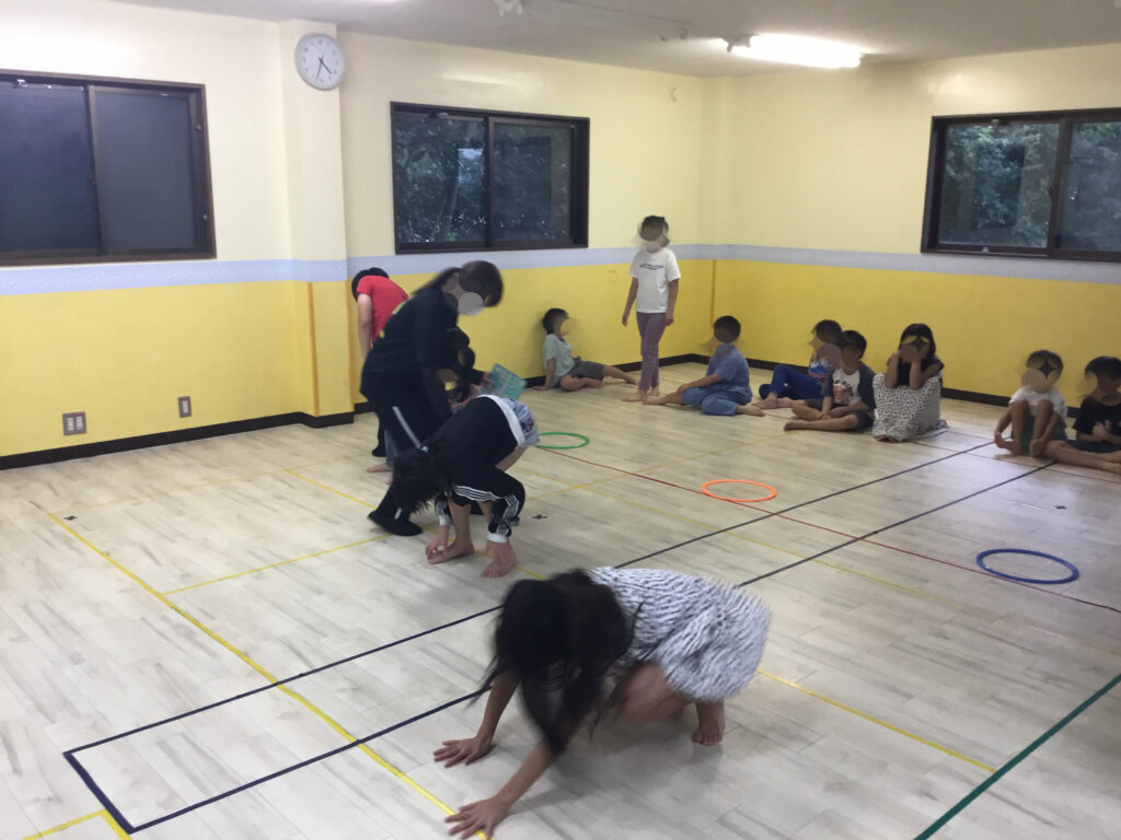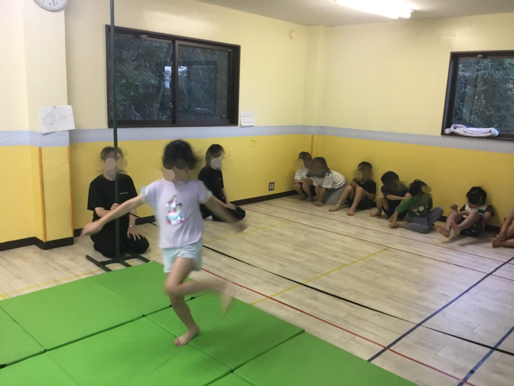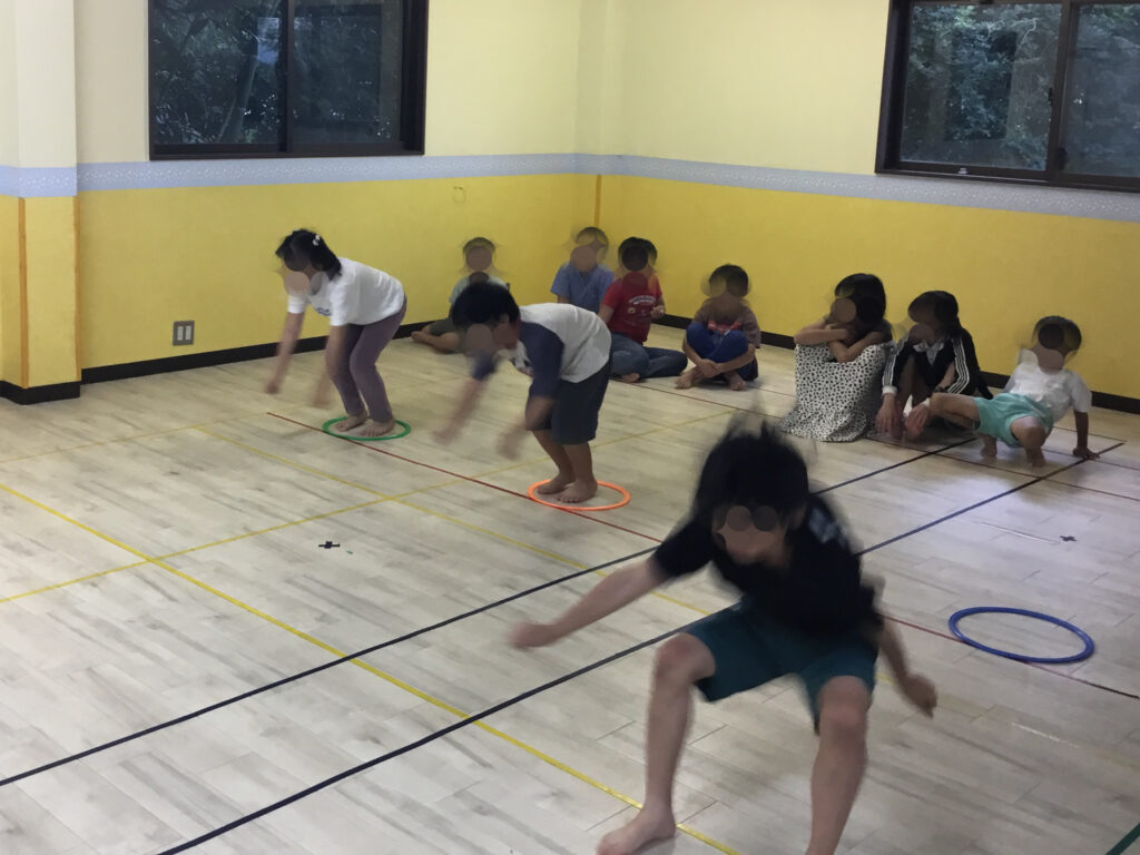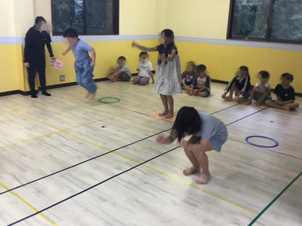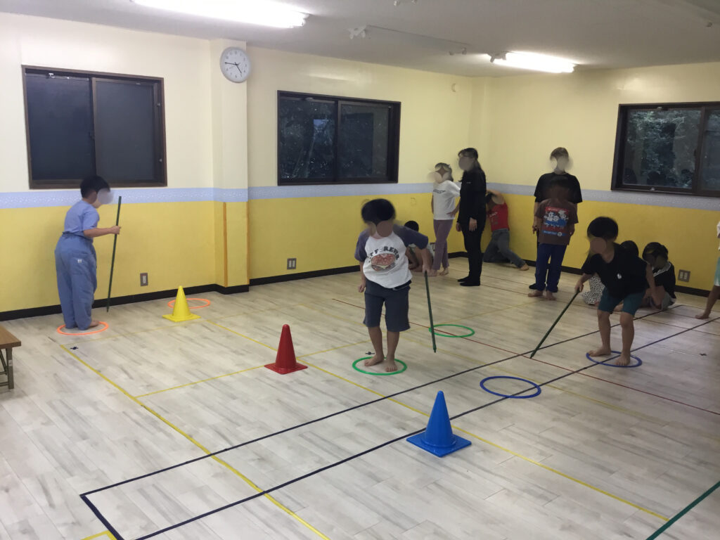 ジャンプハードルでは、低めのハードルをテンポのあるリズムに合わせて軽やかにジャンプしました。指導員の「1、2!」という掛け声に耳を傾け、テンポを意識しながら片足ずつリズムよく跳び越えていきます。リズムに合わせて体を動かすことで、リズム感やタイミングを取る力、そして全身のバランス感覚が育まれます。