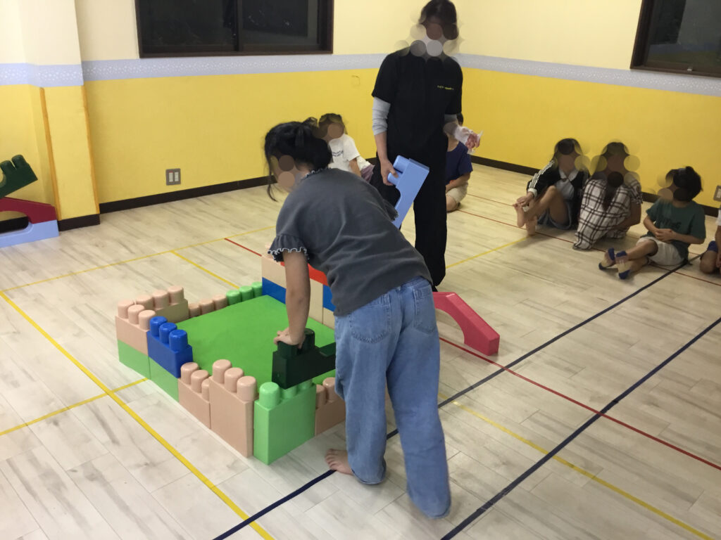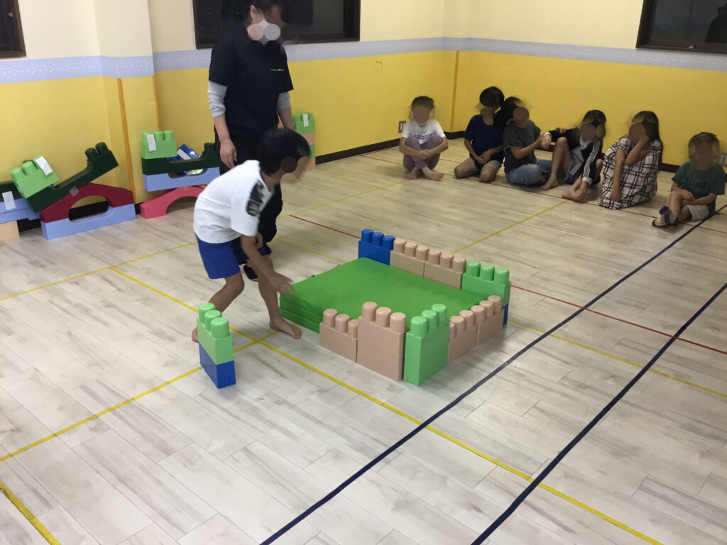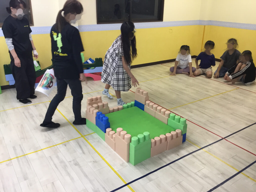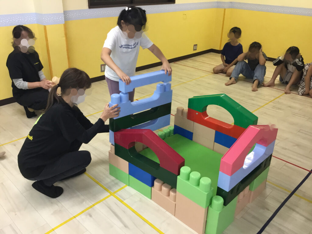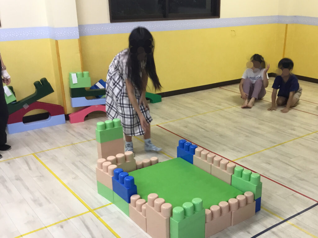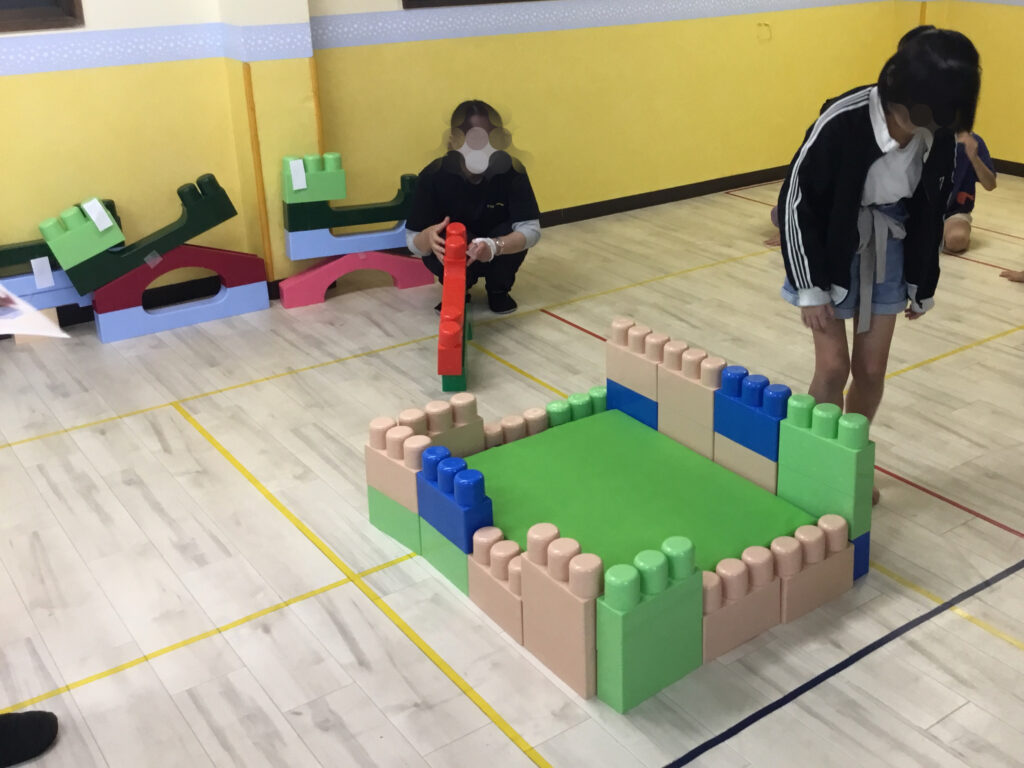 音の高低差を聴き分けて体を動かすことで、聴覚の集中力や音への感受性を育むとともに、協調性や表現力を伸ばすことにつながります。子どもたちは「次はどっちかな?」とワクワクしながら、ピアノの音に合わせて夢中でブロックを組み立てていました🎵