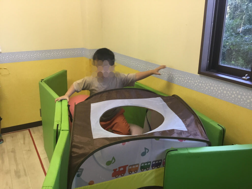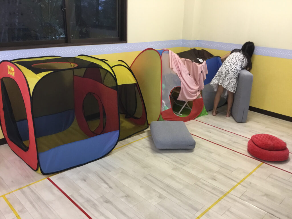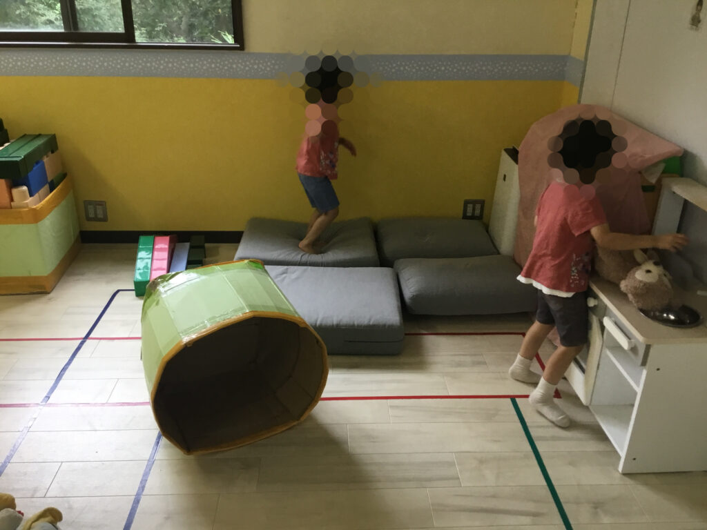 音楽プログラム「音の違いを楽しもう」では、“音の高低差を聴き分けてお家を建ててみよう”に取り組みました。ピアノの音をよく聴き、高い音が聞こえると大型ブロックを上に、低い音が聞こえると横に積み上げていきます。音の変化に耳を澄ませながら、友だちと協力して一つの大きなお家を完成させました。