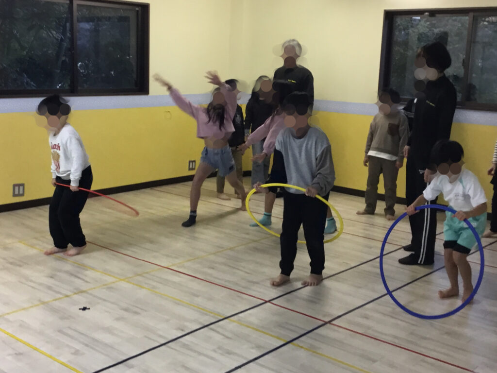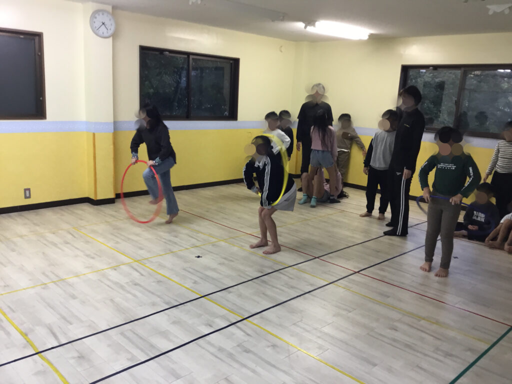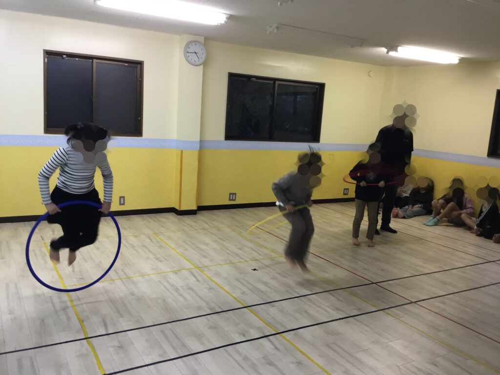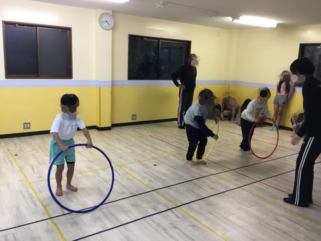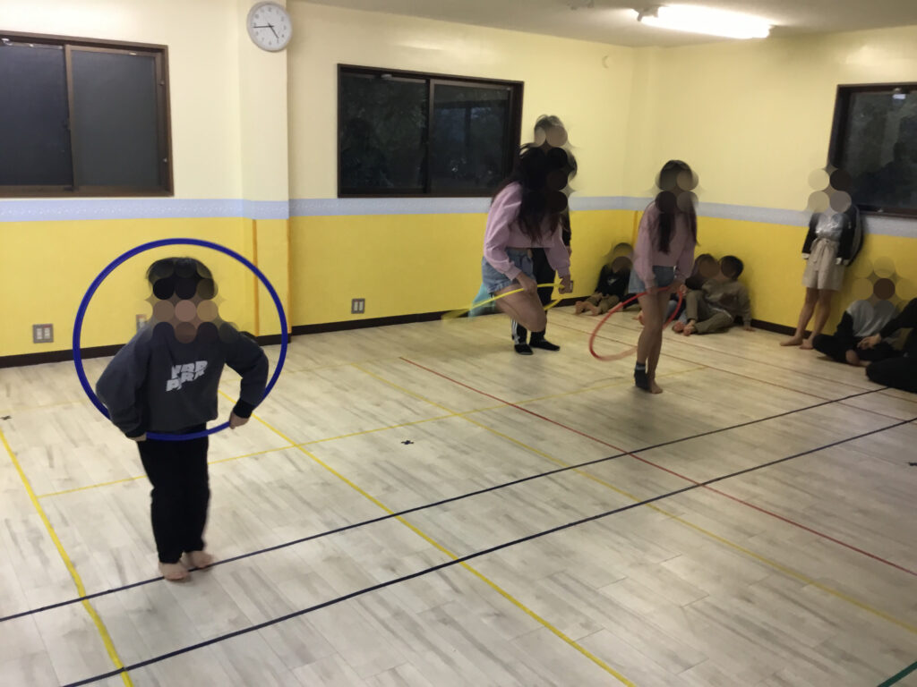 フラフープの活動では、フラフープを回転させながら片足ずつ潜って進む「回転ジャンプ」と、その場で両足をそろえて跳ぶ「回転ジャンプ」にチャレンジしました。