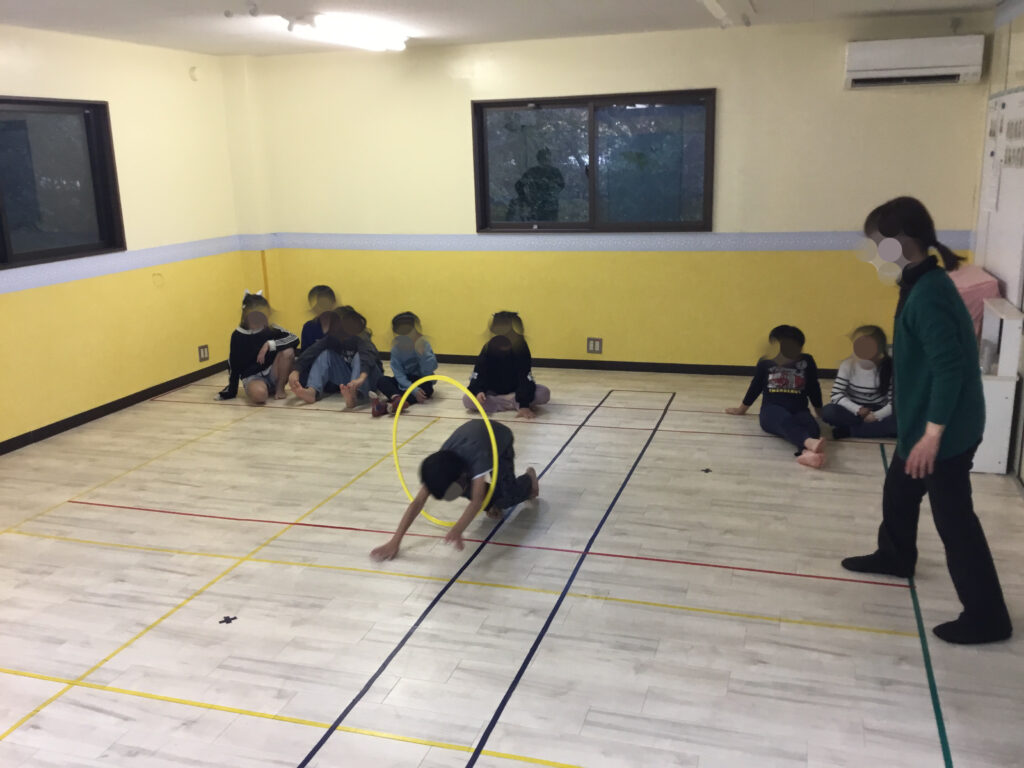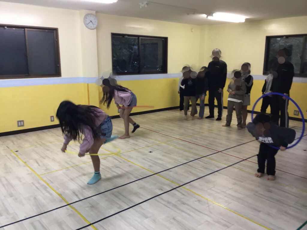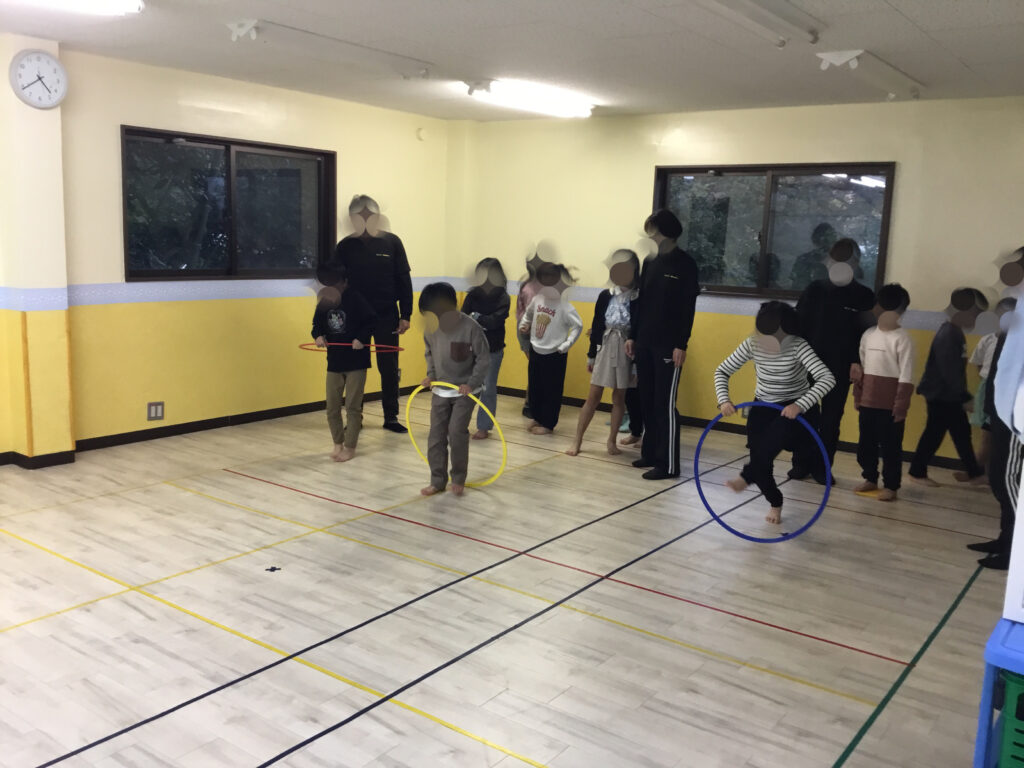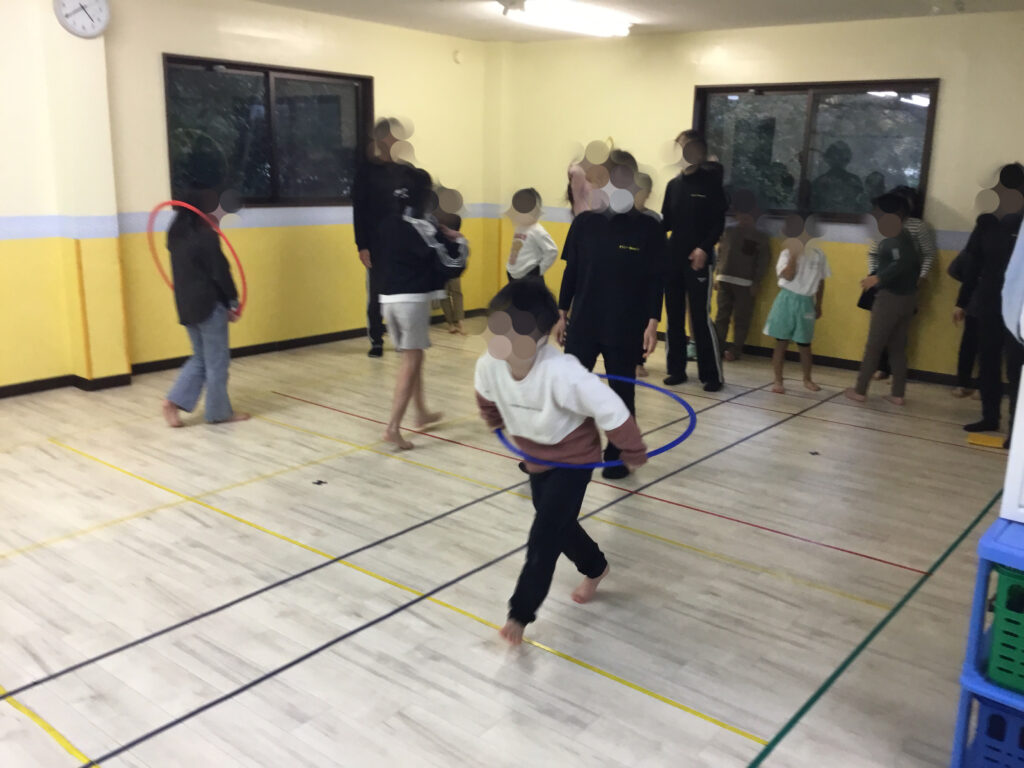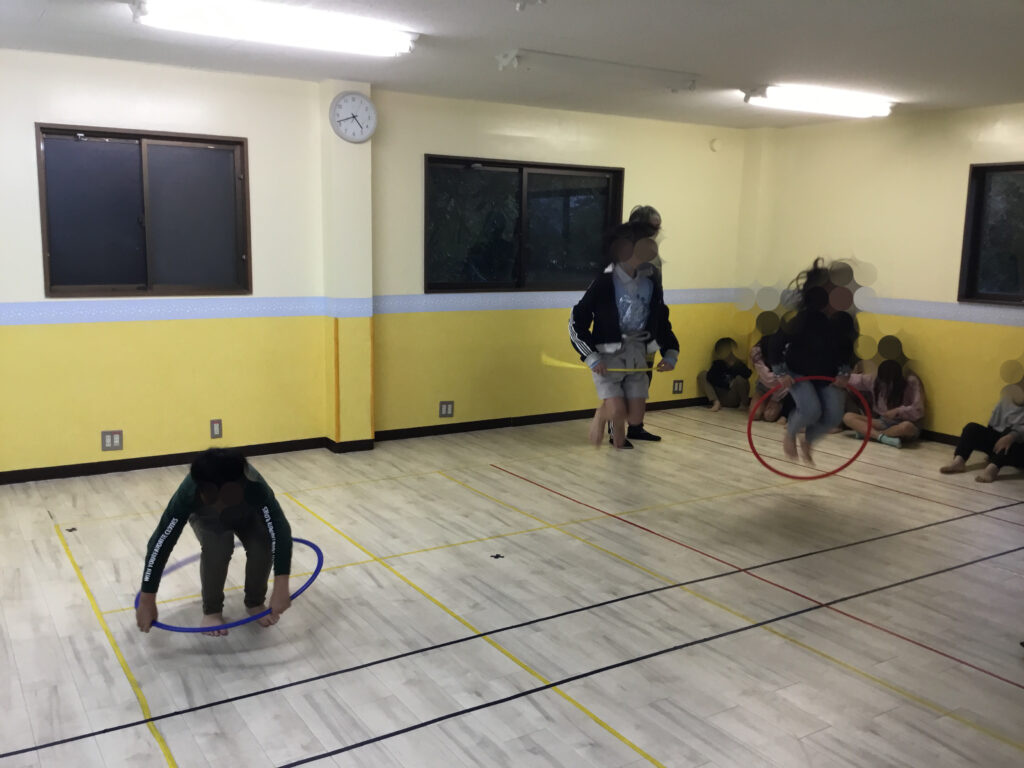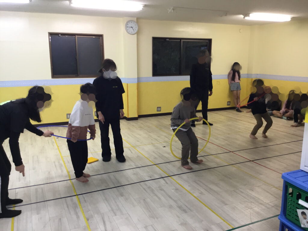 フラフープの活動では、フラフープを回転させながら片足ずつ潜って進む「回転ジャンプ」と、その場で両足をそろえて跳ぶ「回転ジャンプ」にチャレンジしました。