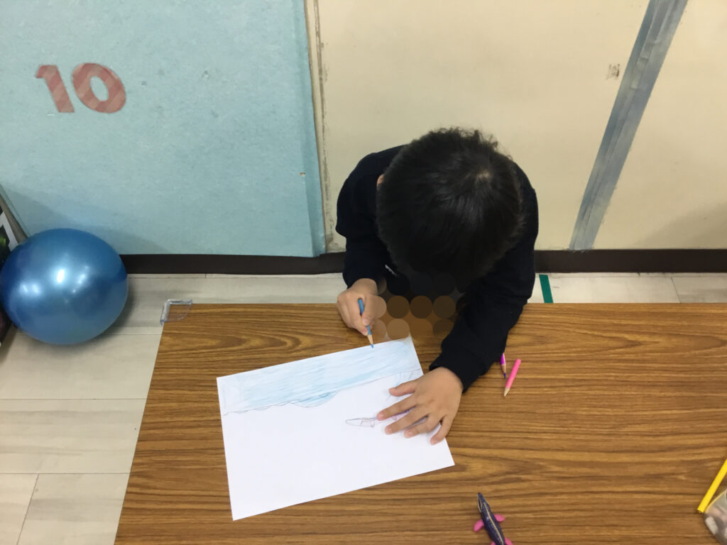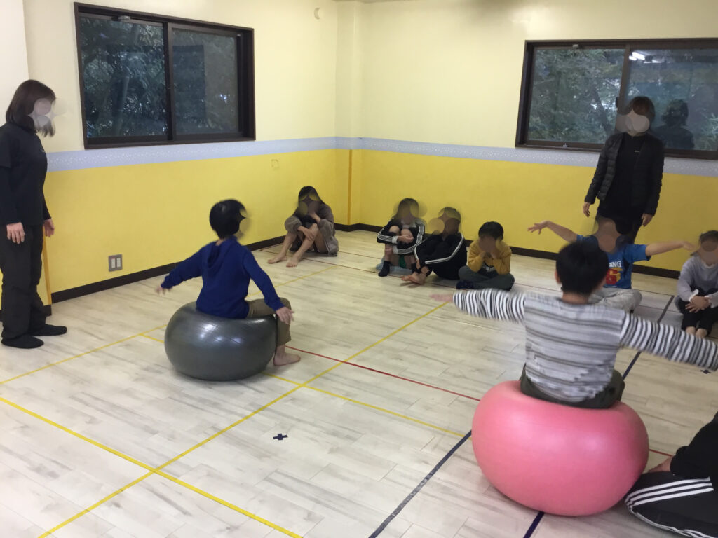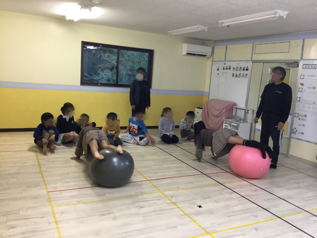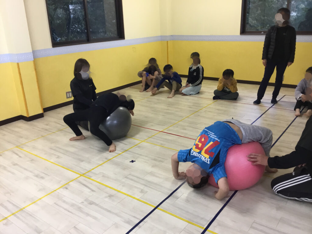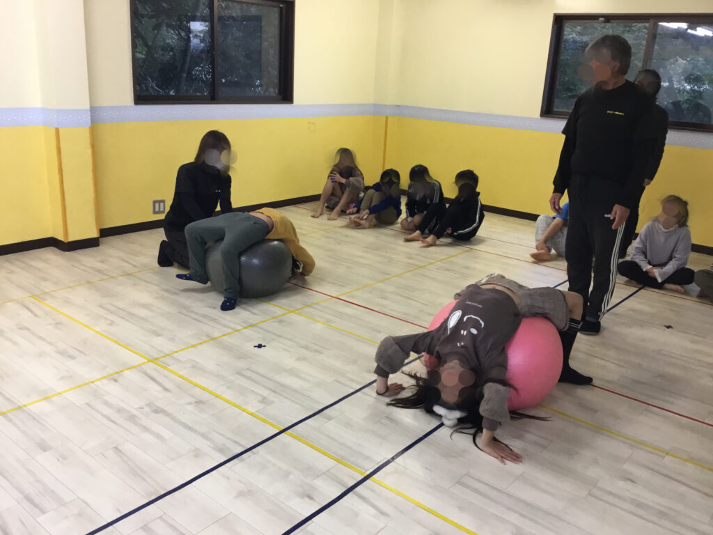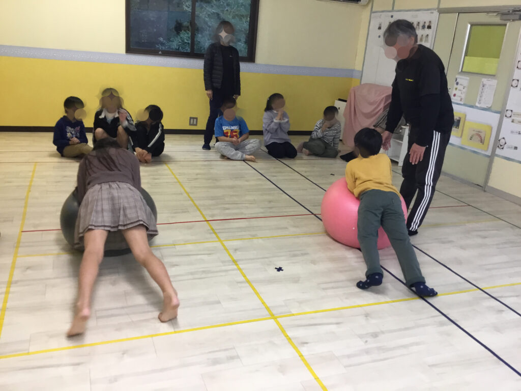 バランスボールの活動では、まず両手を横に大きく広げ、そっとお尻を乗せてバランスをとるところからスタートしました。身体の中心を意識しながら、ぐらついても自分で姿勢を立て直そうとする姿がとても印象的でした。ブリッジの姿勢でボールの上に体をあずけてキープ!体幹をしっかり使いながら、手足の位置を細かく調整し、安定した姿勢を保つことに挑戦しました。各自自分で選んで挑戦しました。