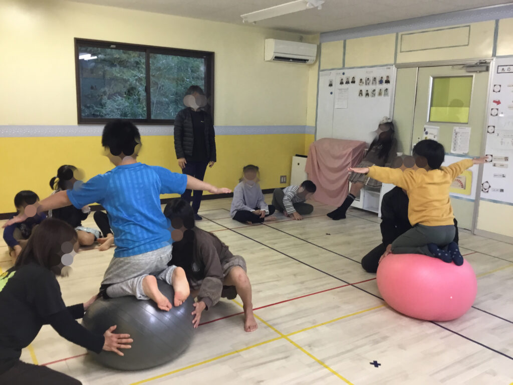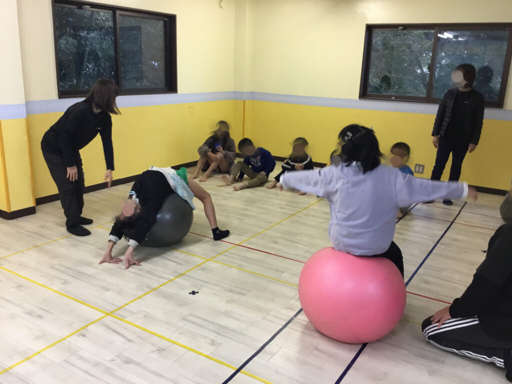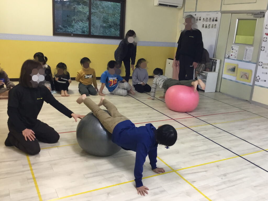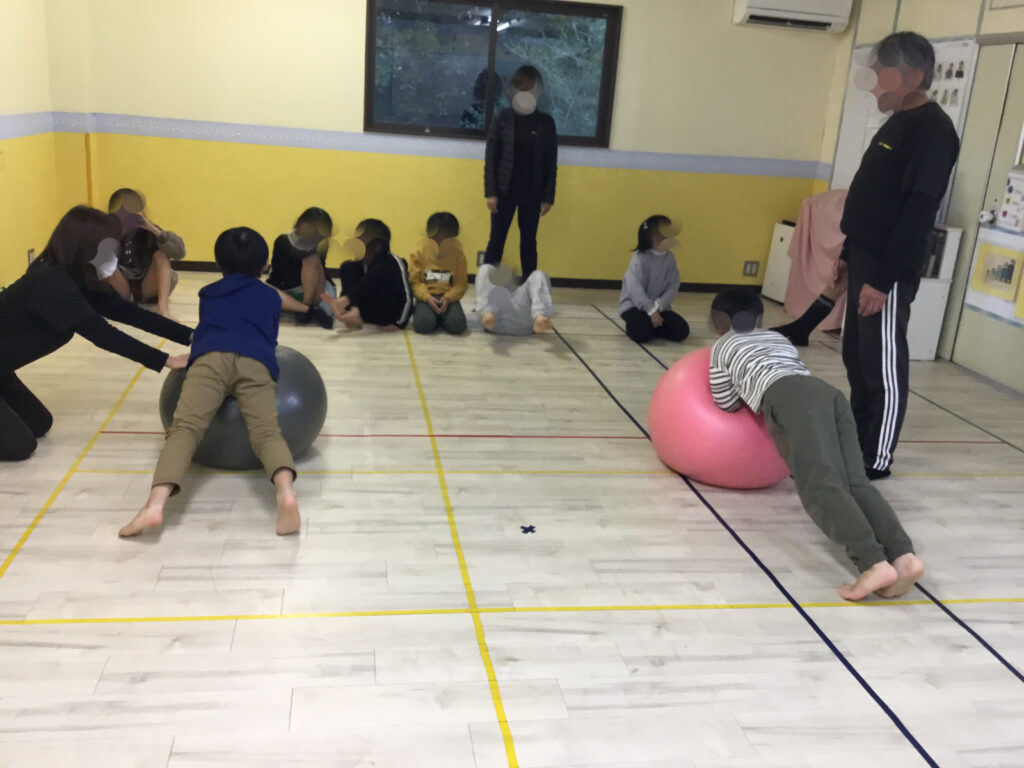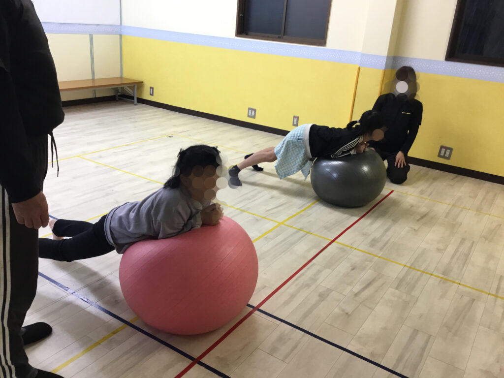 その後は、足や肘を順番にボールへ乗せて、10秒間のバランスキープに挑戦!「落ちないように…」と集中しながらも、できた瞬間にはにこっと嬉しそうな表情が見られ、達成感につながっていました。