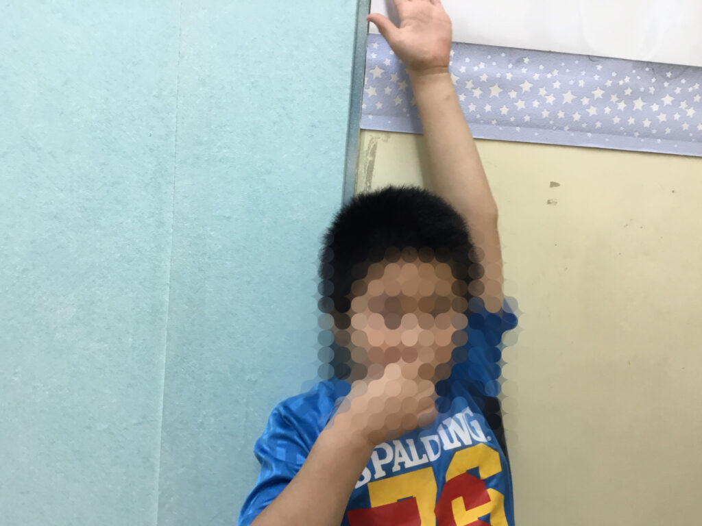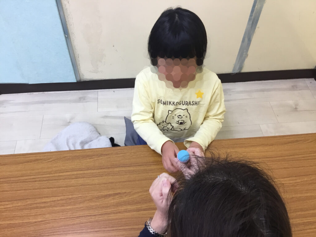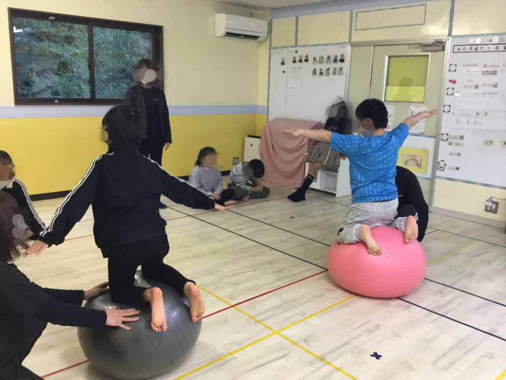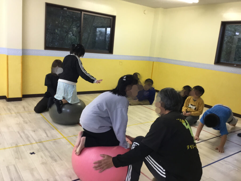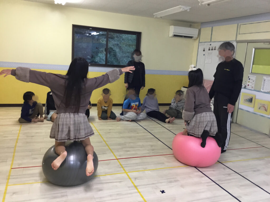 その後は、足や肘を順番にボールへ乗せて、10秒間のバランスキープに挑戦!「落ちないように…」と集中しながらも、できた瞬間にはにこっと嬉しそうな表情が見られ、達成感につながっていました。