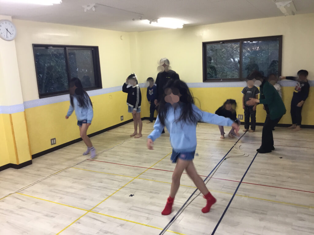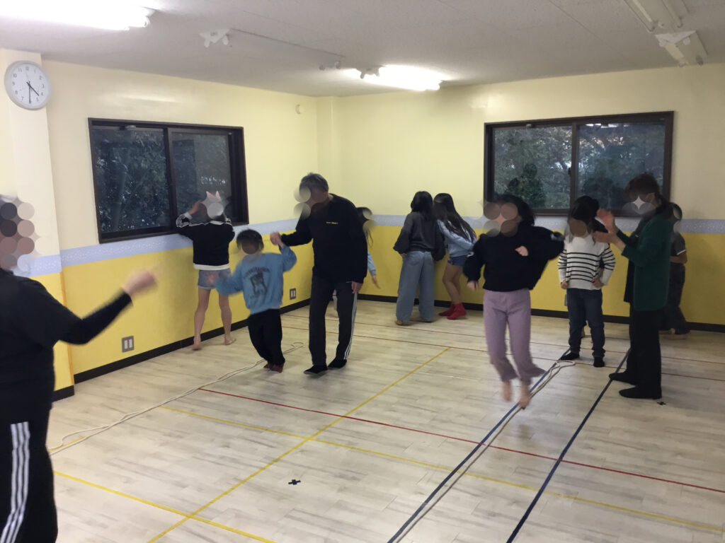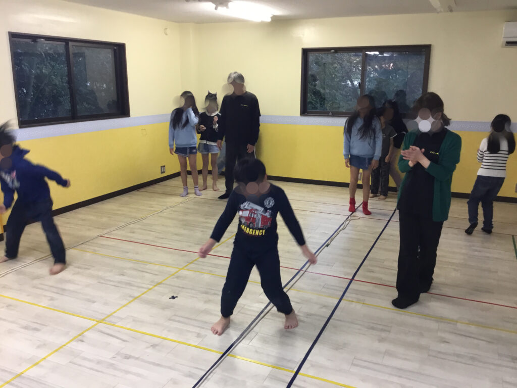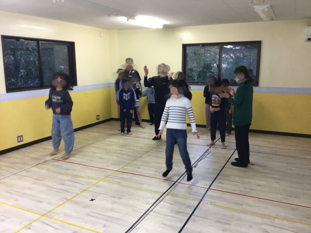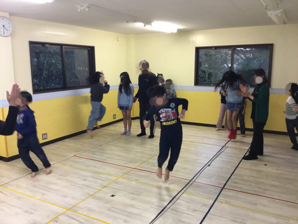 足を開いたり閉じたり、方向を変えたりと複雑な動きが続く中でも、リズムに合わせてステップを踏むことで、動きがだんだんとスムーズになり、ジャンプしながら前へ進む姿がとても生き生きとしていました。リズムをずらさないように集中しながらも、できた瞬間には嬉しそうに表情がほころび、達成感が伝わってきました。