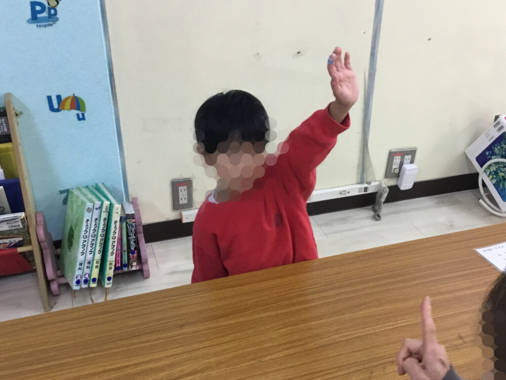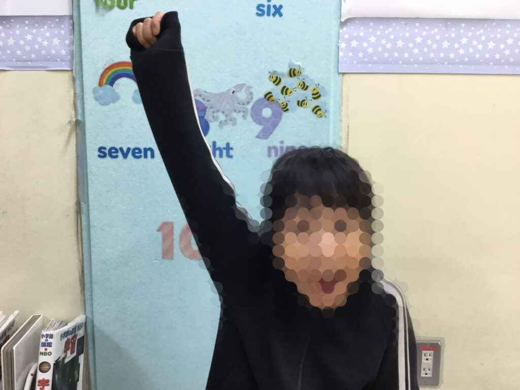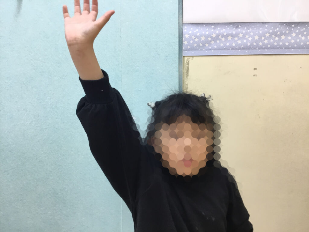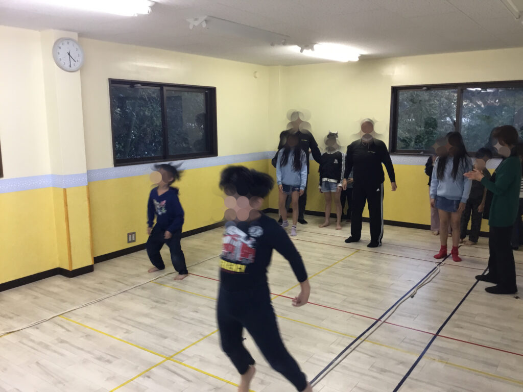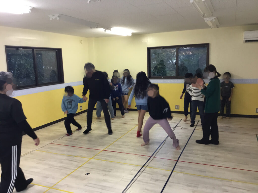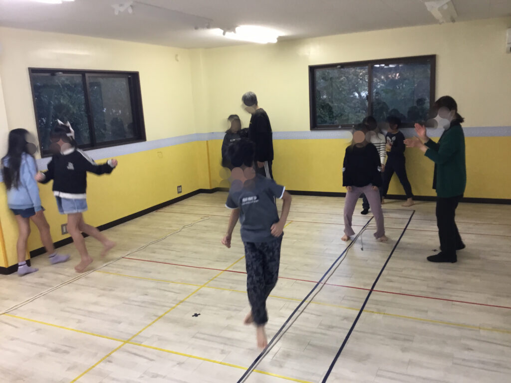 足を開いたり閉じたり、方向を変えたりと複雑な動きが続く中でも、リズムに合わせてステップを踏むことで、動きがだんだんとスムーズになり、ジャンプしながら前へ進む姿がとても生き生きとしていました。リズムをずらさないように集中しながらも、できた瞬間には嬉しそうに表情がほころび、達成感が伝わってきました。