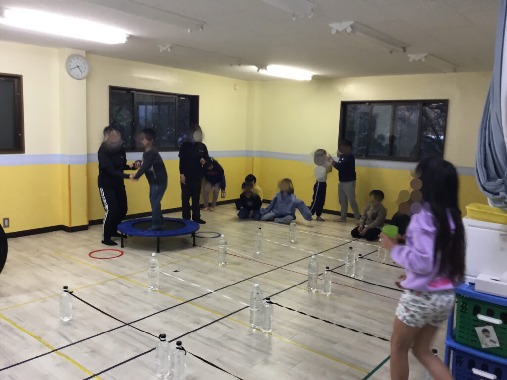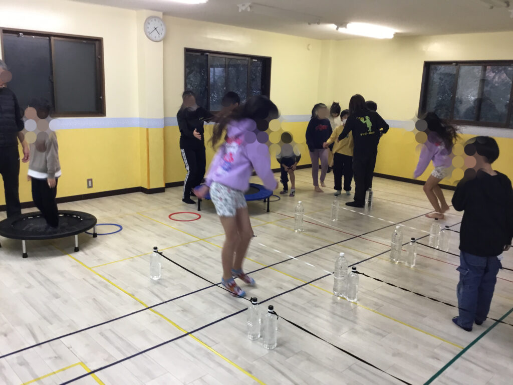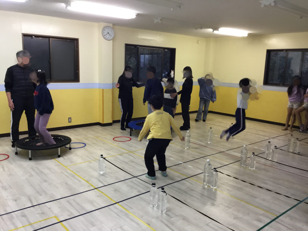 トランポリンでは、両足をそろえた「グー」や足を開く「パー」のジャンプに挑戦したり、バランスを意識しながら回転動作にもチャレンジしました。体の動きをコントロールしながら跳ぶことで、体幹やバランス感覚、瞬時に姿勢を整える力が育まれました。