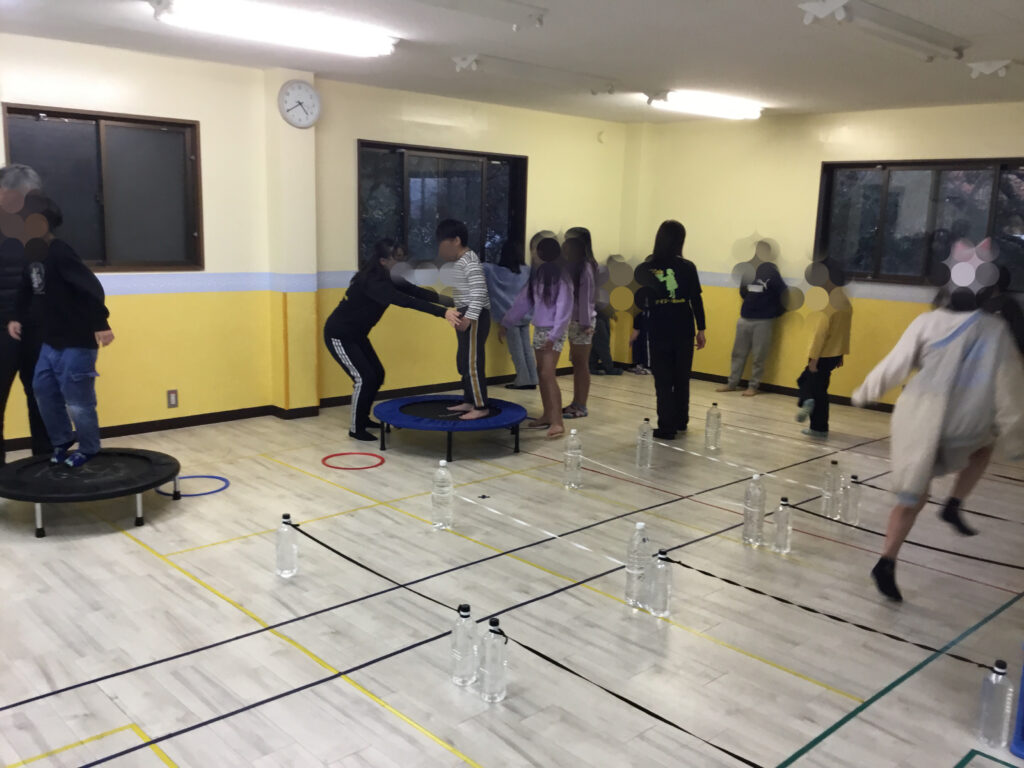 トランポリンとハードルを組み合わせたサーキットコースでは、はじめにトランポリンの安全な乗り方・降り方について丁寧に説明を聞き、再確認して、「歩いて乗る・歩いて降りる」ことを意識しながら、お約束を守って落ち着いて参加することができました。