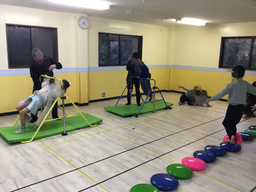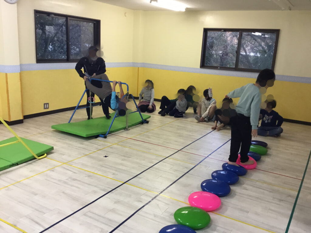 先週の運動プログラムの「エンジョイサーキット」では、“トランポリン・ハードルサーキット”“鉄棒・バランスクッションサーキット”“マット・ポックリサーキット”“フラフープ・バランスブロックサーキット”に取り組みました✨
