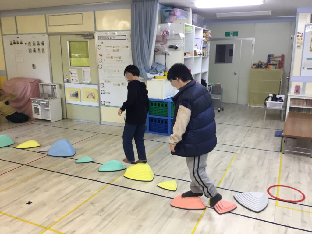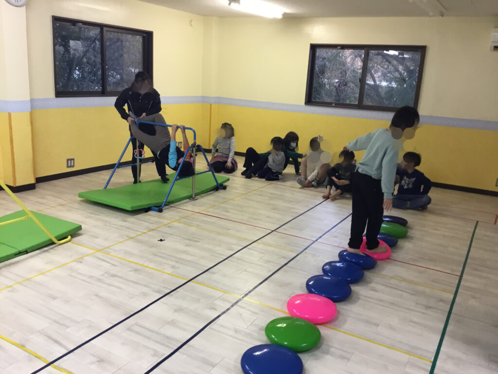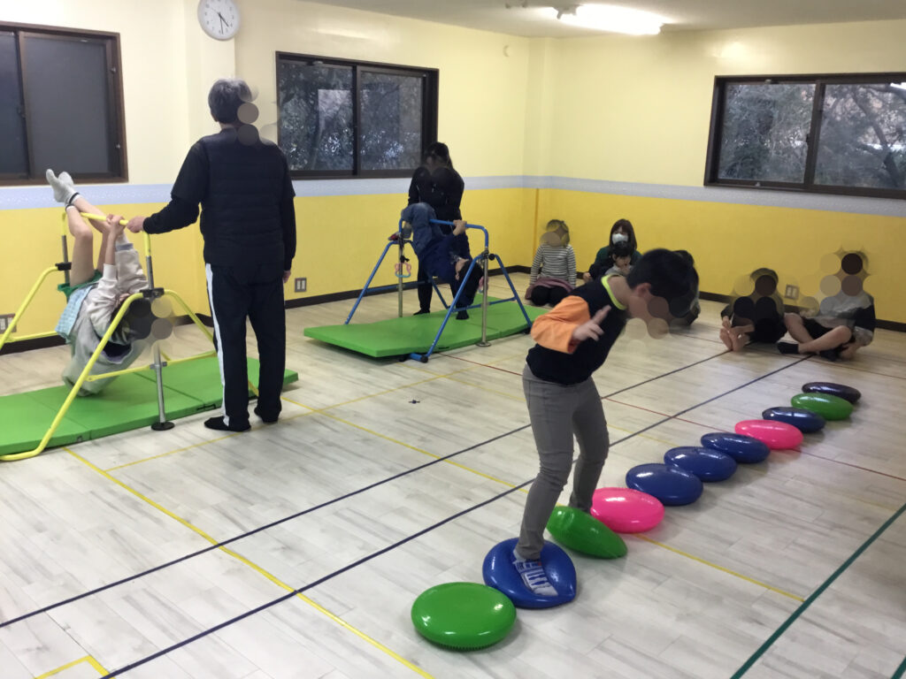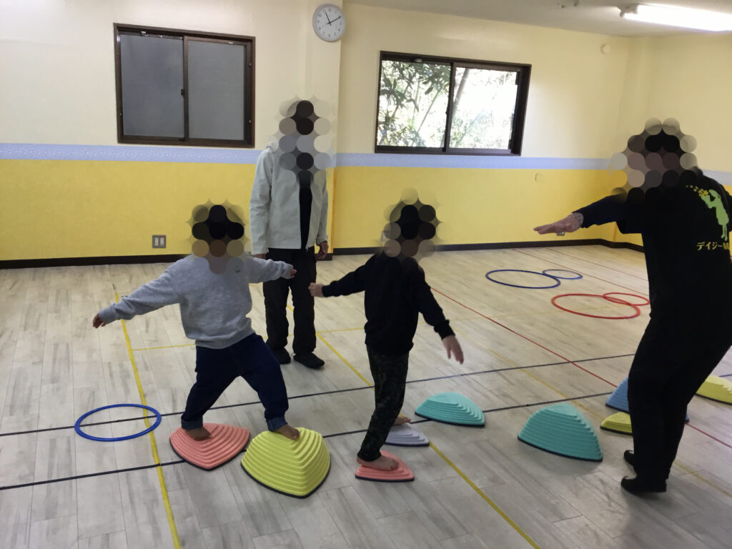 バランスクッションでは、クッションの不安定さを感じながら、前向き・横向きなど様々な方向でバランスをとったり、ピンクのバランスクッションの上で片足立ちや回転に挑戦しました。体の軸を意識して姿勢を保つことで、体幹やバランス感覚、集中力を養うことができました。