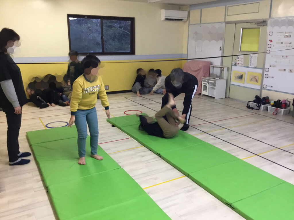 マットとポックリを組み合わせたサーキットコースでは、マット運動で丸太転がりやカエルの足打ちなどの基本的な動きに取り組み、腕を伸ばして回転したり体を小さく丸めたり、手足をしっかり使うことを意識しながら活動しました。前転では、手のつき方や頭の位置を意識して一つひとつの動きを確認し、くるんと回った後は自信いっぱいの「ハイポーズ!」できた喜びが表情や姿勢から伝わってきました。
