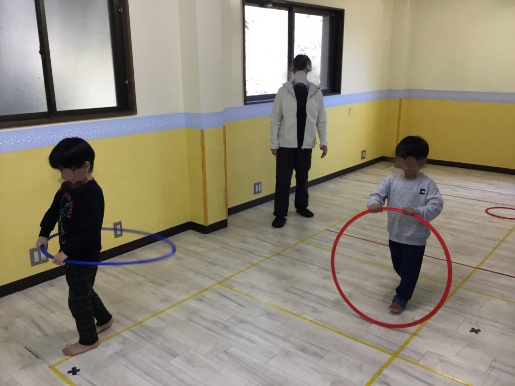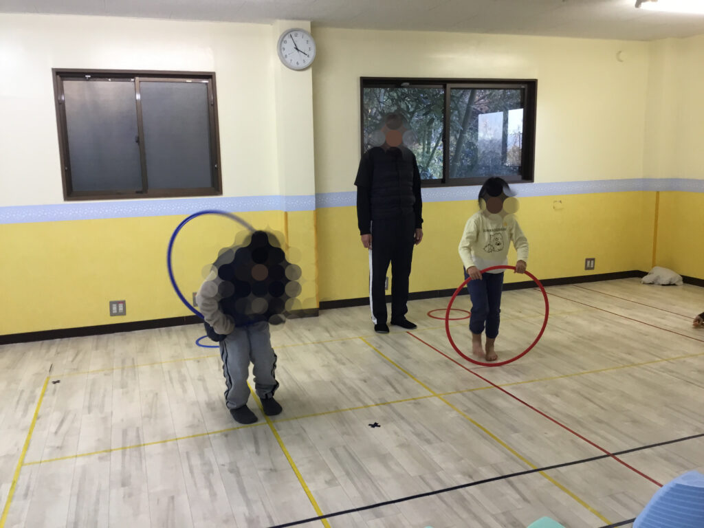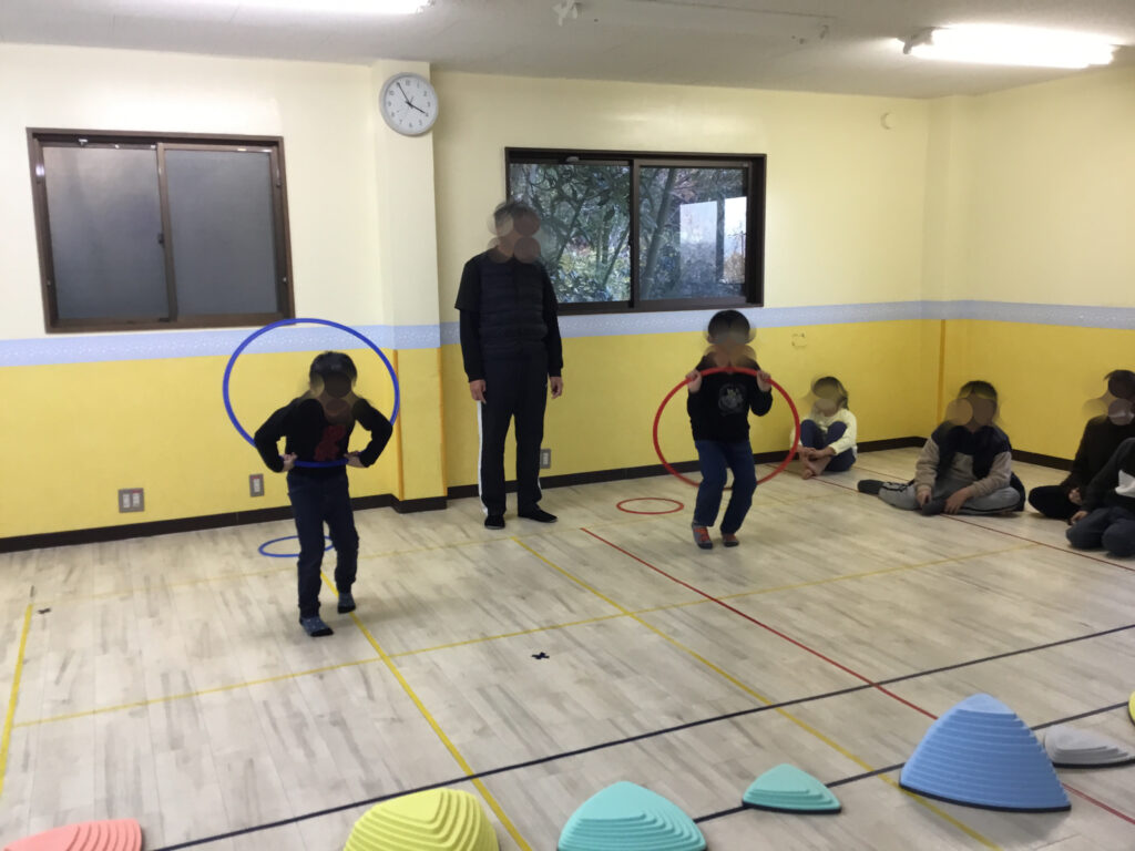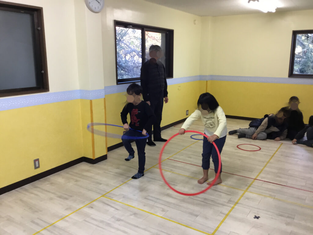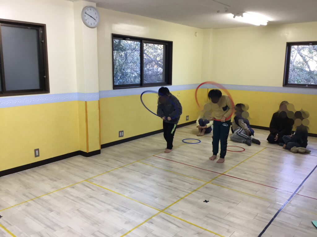 次は、その場での両足跳びのフラフープジャンプにチャレンジ!フラフープが回ってくるタイミングをよく見て、「今だ!」と集中しながらジャンプする姿が見られ、判断力や集中力を高める活動となりました。