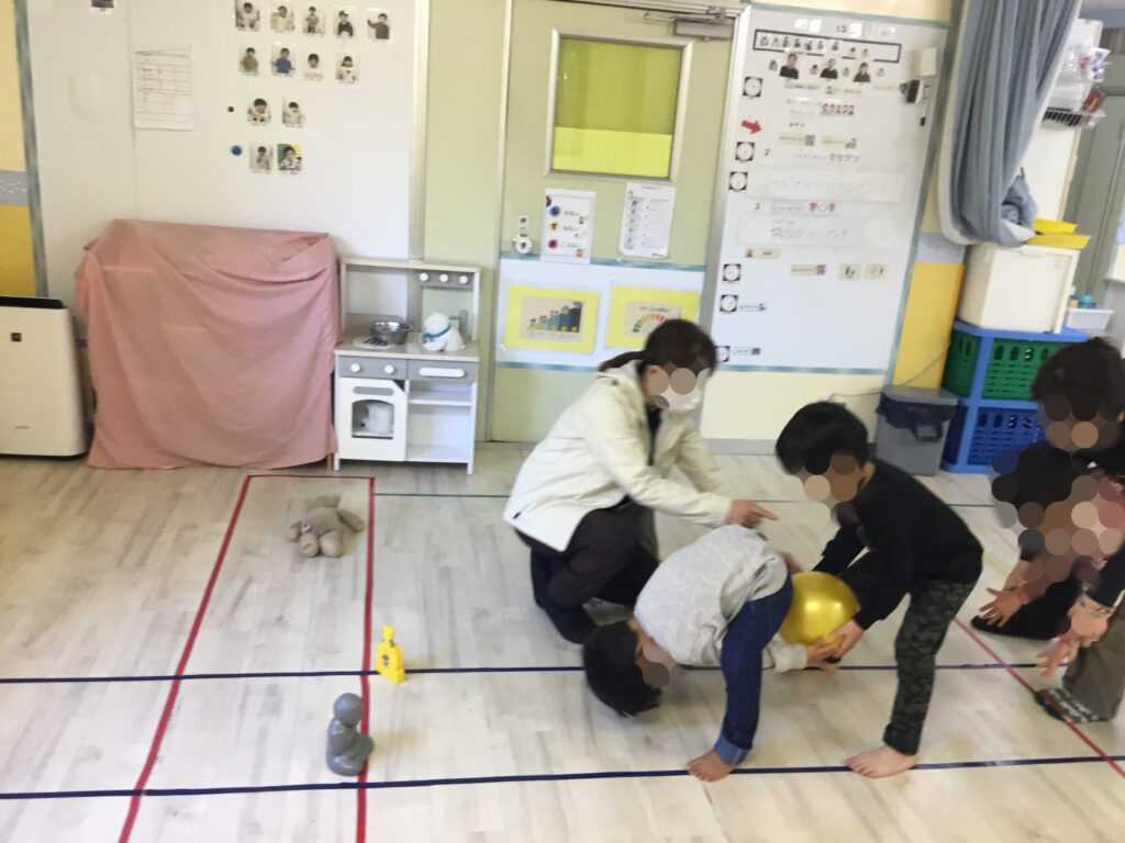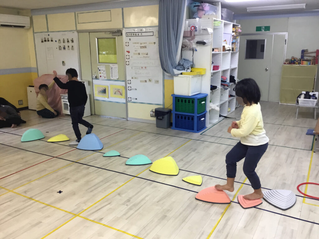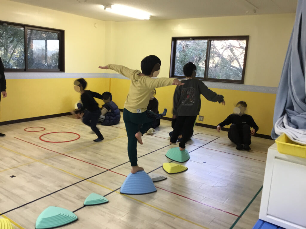 バランスブロックでは、両手を広げてバランスをとりながら進んだり、1番高いバランスブロックの上でポーズを決めたり回転したりと、楽しみながら挑戦しました。不安定な足場の中で姿勢を保つことで、体幹やバランス感覚、自己表現力を育むことができました。