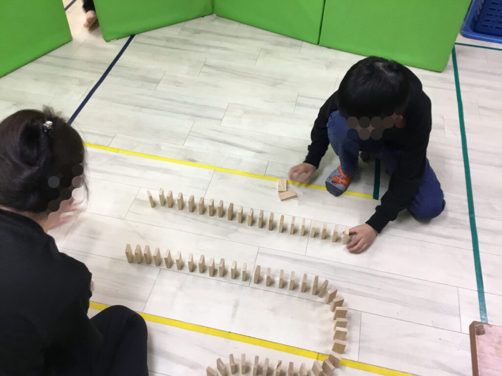 フラフープとバランスブロックを組み合わせたサーキットコースでは、フラフープを回転させながら足を順番にフラフープの中へ入れ、走り跳びのような動きで直線コースを進むことに挑戦しました。フラフープの動きに合わせて足を運ぶことで、リズム感や跳躍力、タイミングをつかむ力が自然と養われていきました。